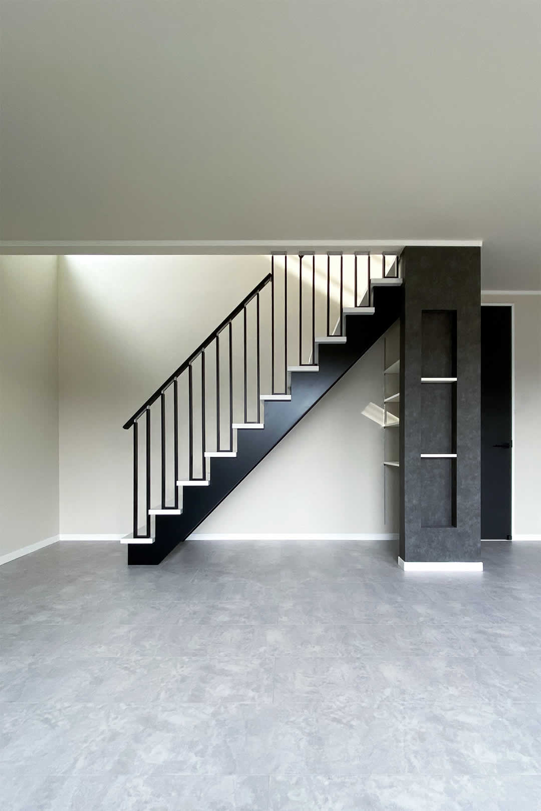 格子の手すりが素敵なスケルトン階段はお部屋の主役。スタシッリュなリビングを演出します。