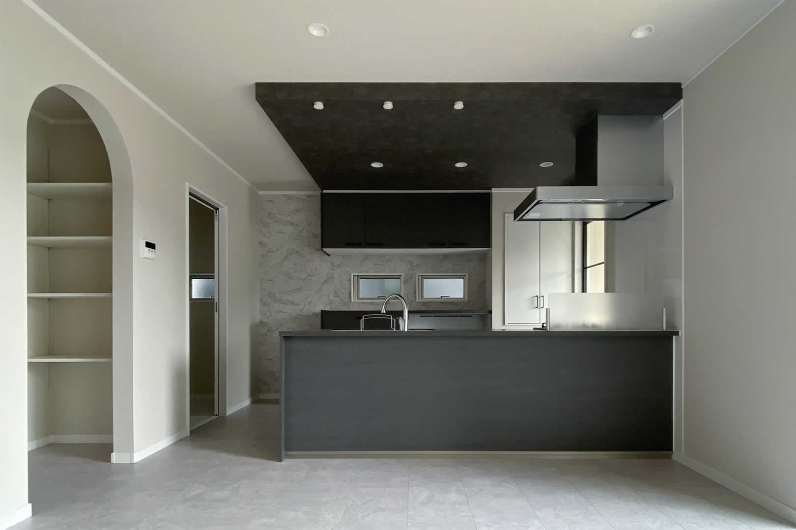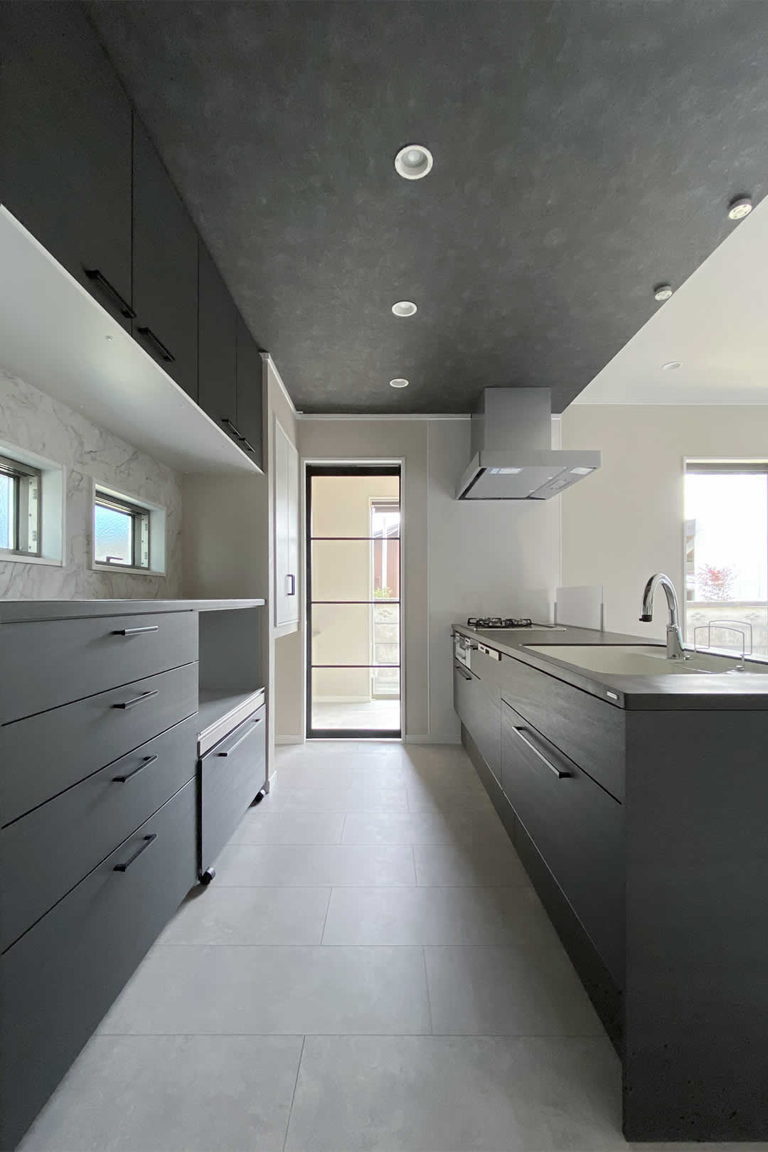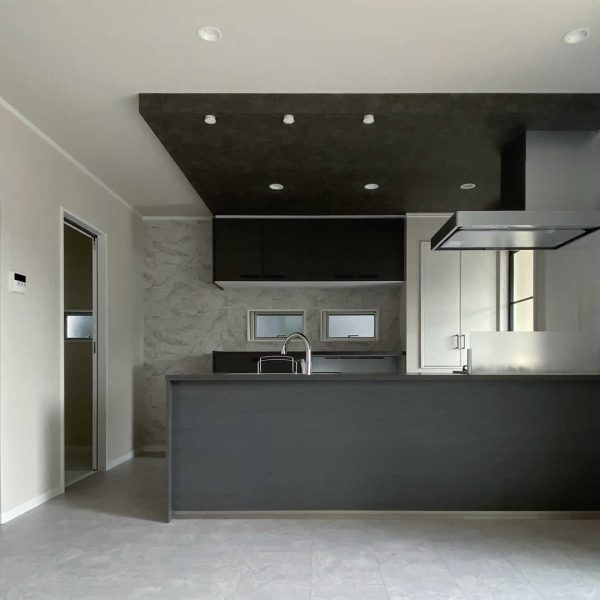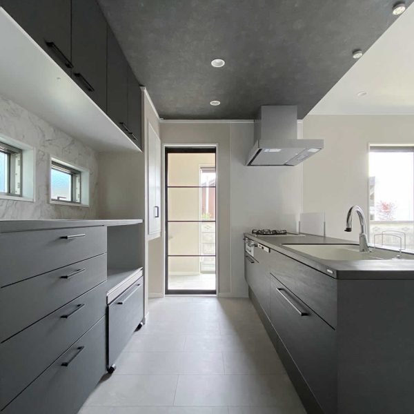 ブラックでまとめられたオープンキッチン。たっぷりの収納とパントリーも設置しています。
