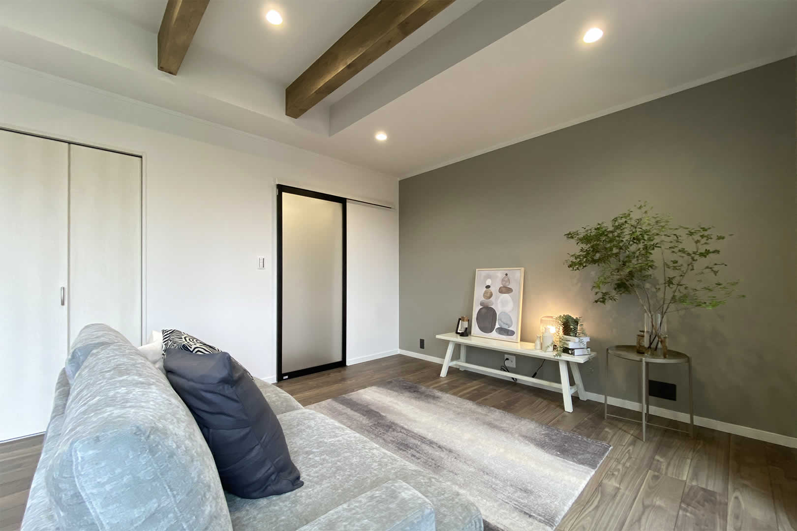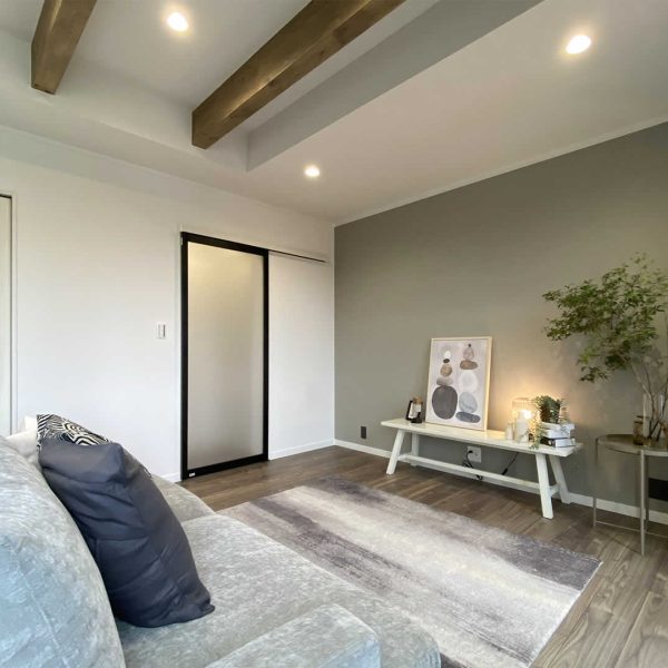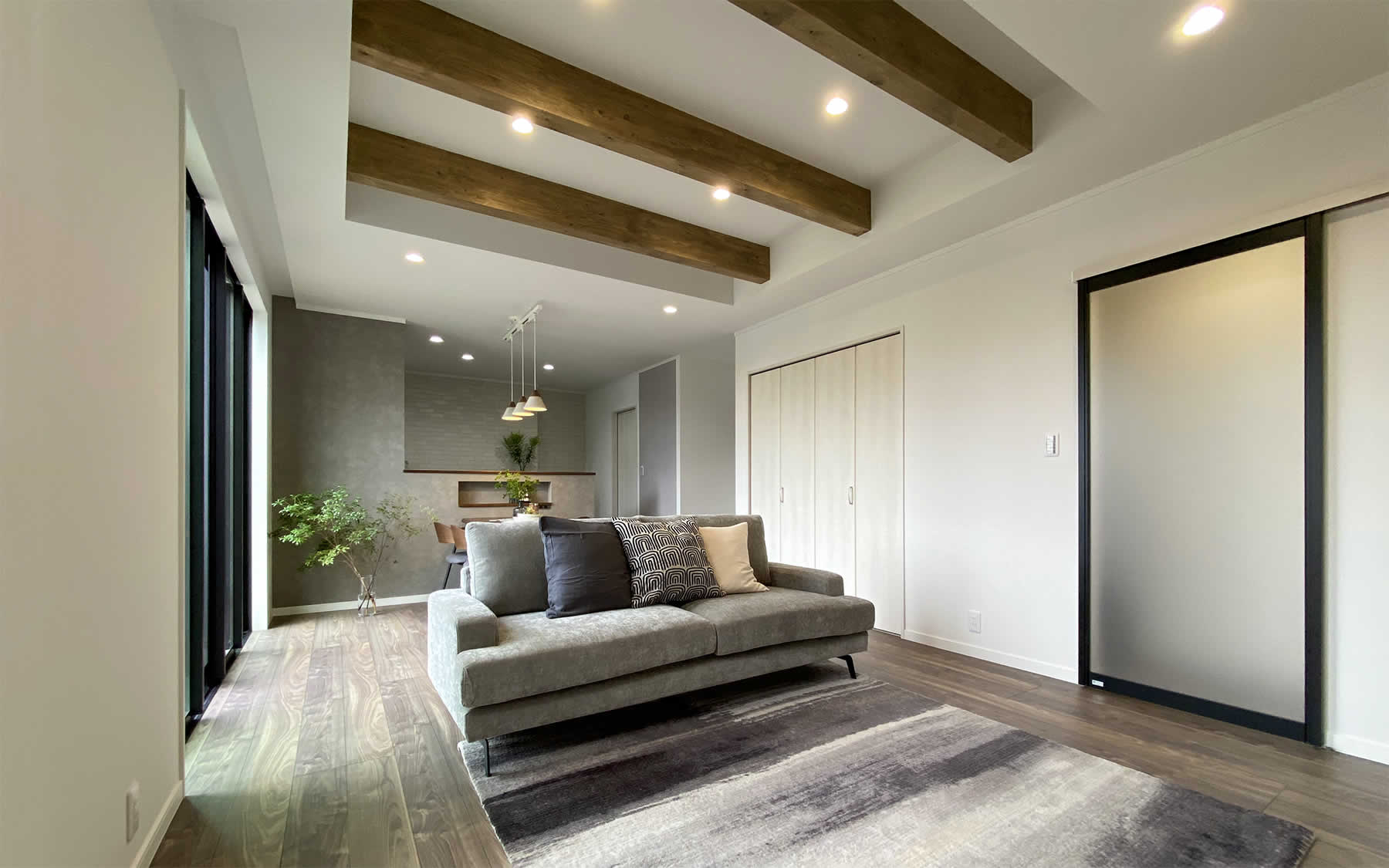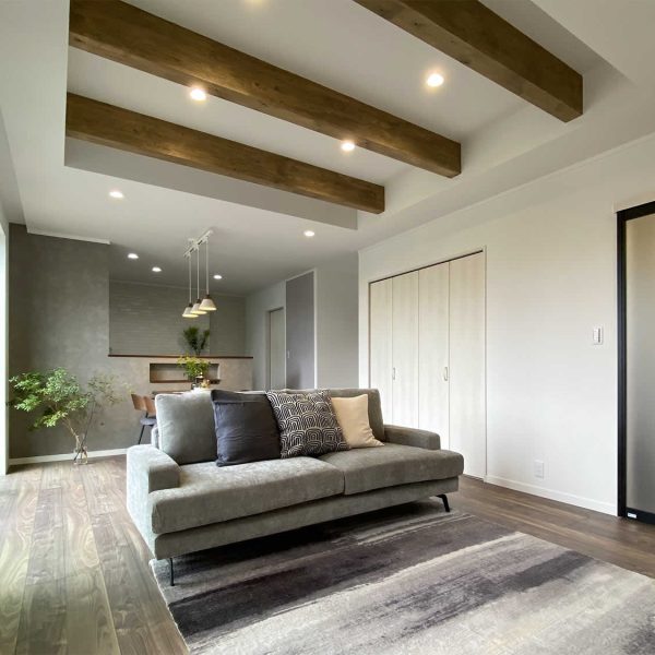 グレーと木目を基調とした北欧モダンスタイルのスタイリッシュなリビングは家族みんなが落ち着ける空間に仕上がっています。