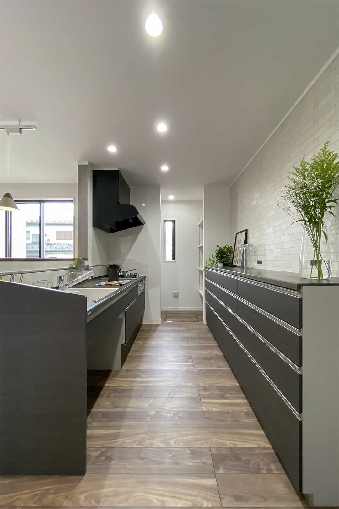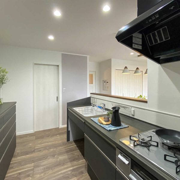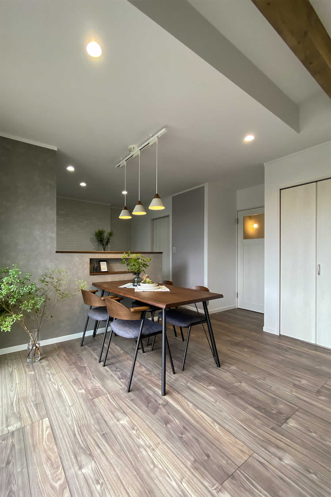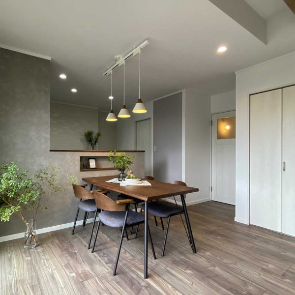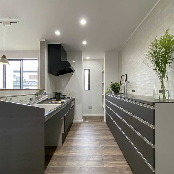 グレーと木目を基調とした北欧モダンスタイルのスタイリッシュなリビングは家族みんなが落ち着ける空間に仕上がっています。