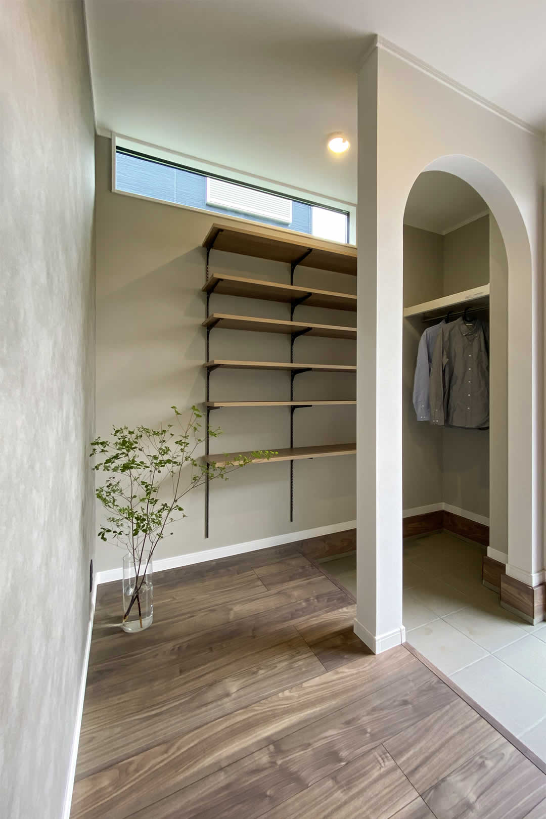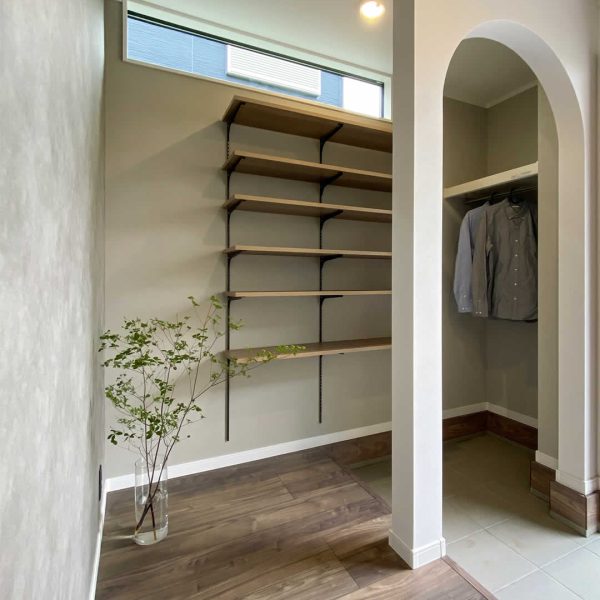 シンプルな棚板のシューズクローゼットは見せる収納に。