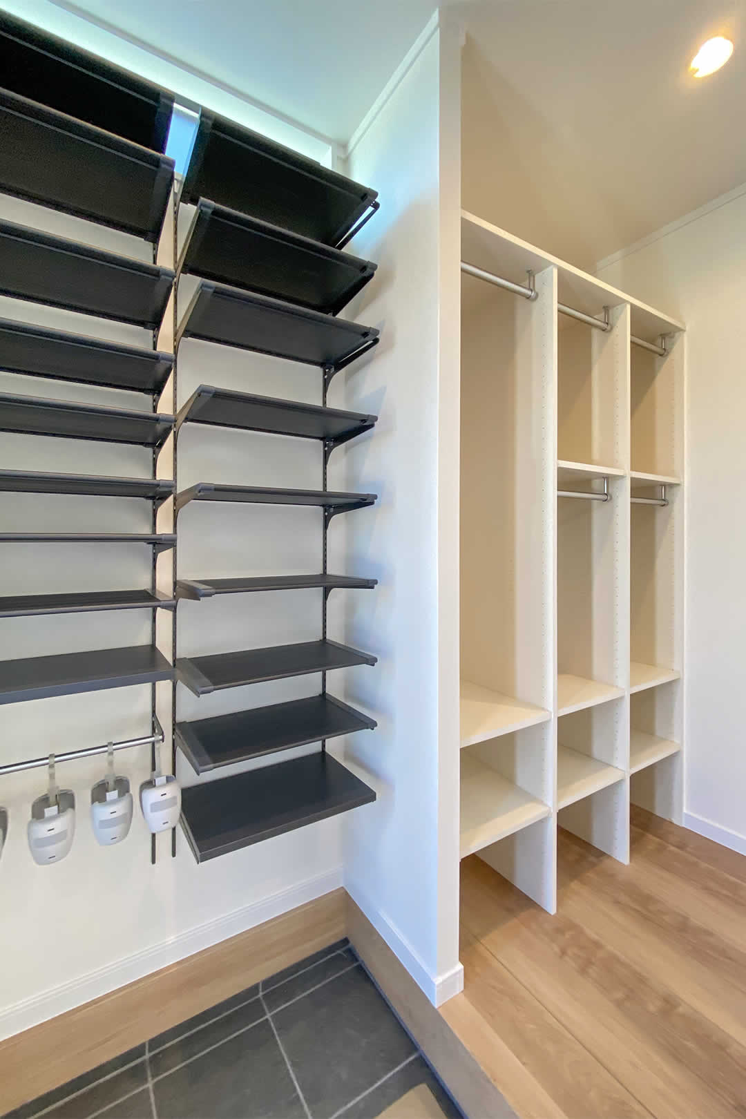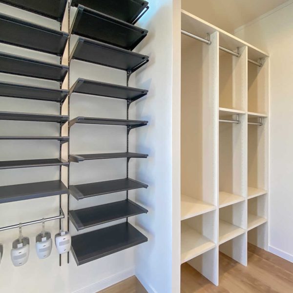 家族それぞれのクローゼット棚と高さを変えられるシューズ棚があり、ブーツもそのまましまうことができるので型が変わらず安心です。