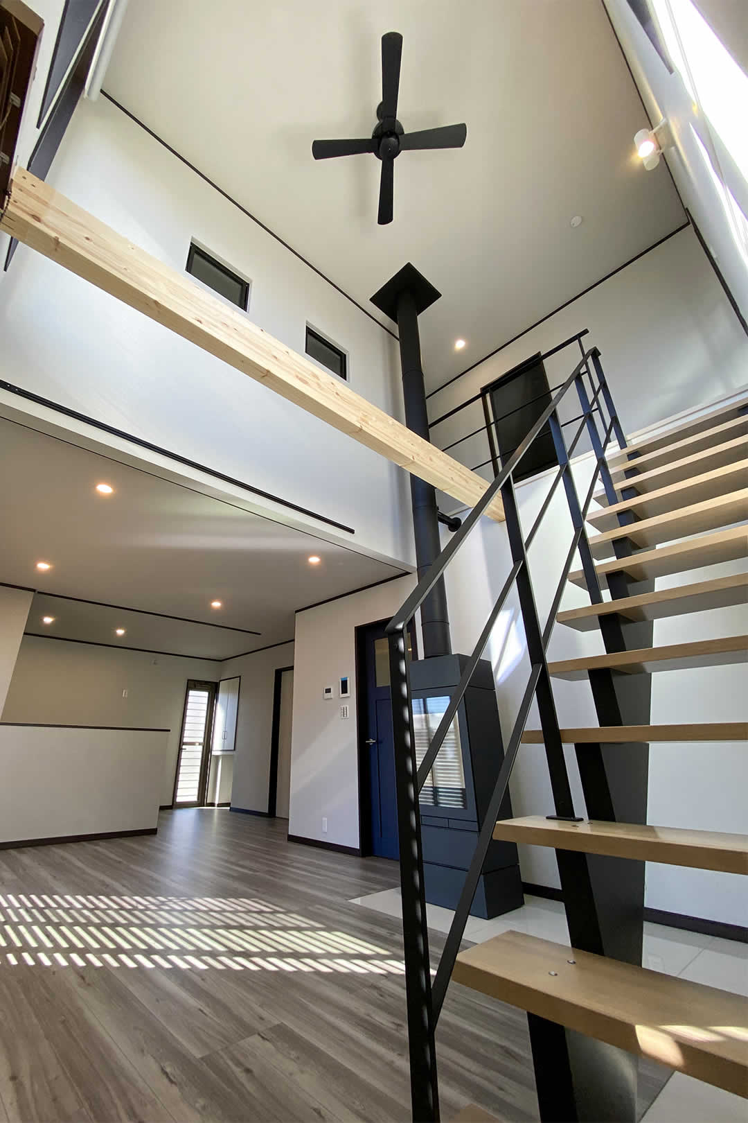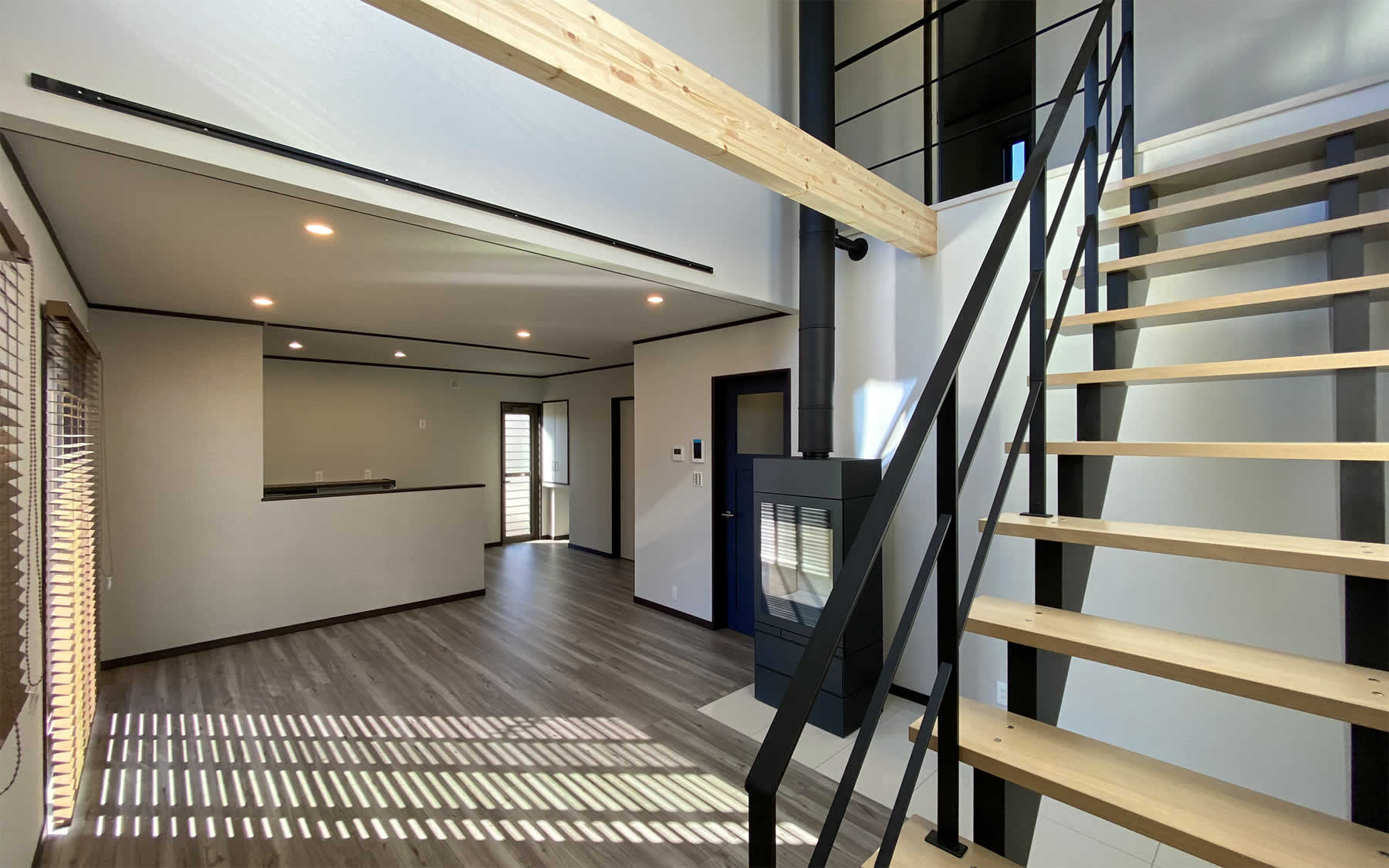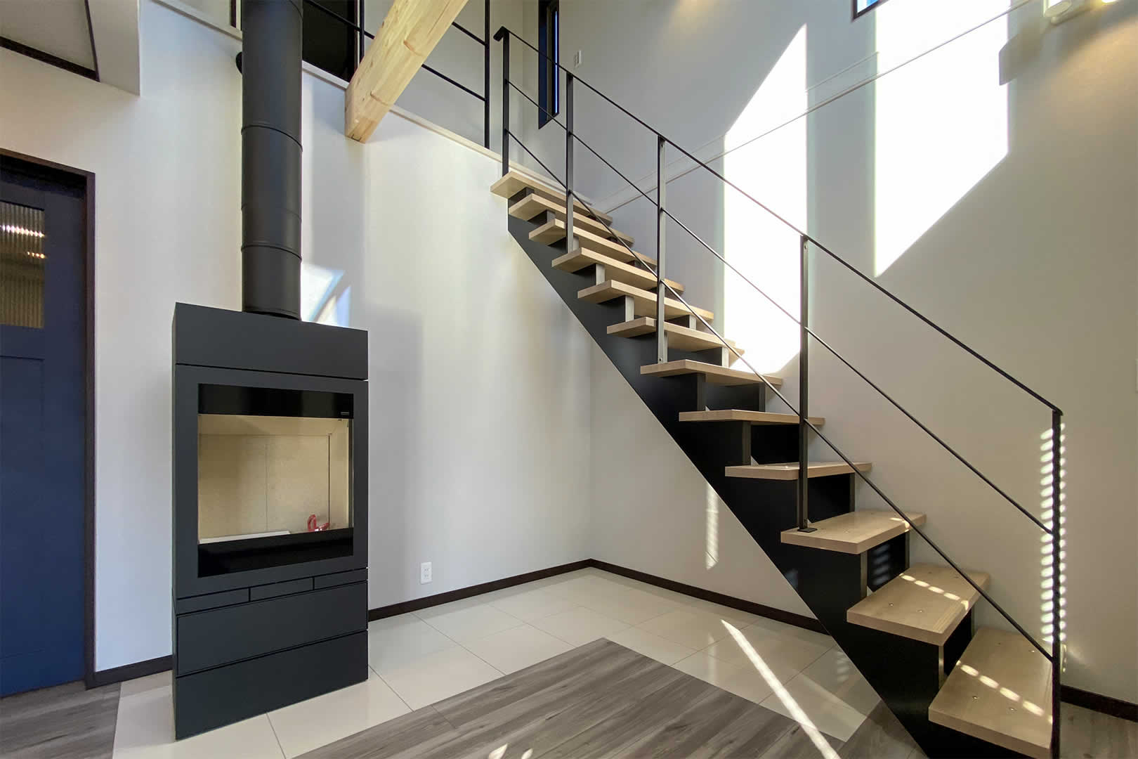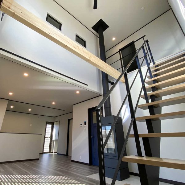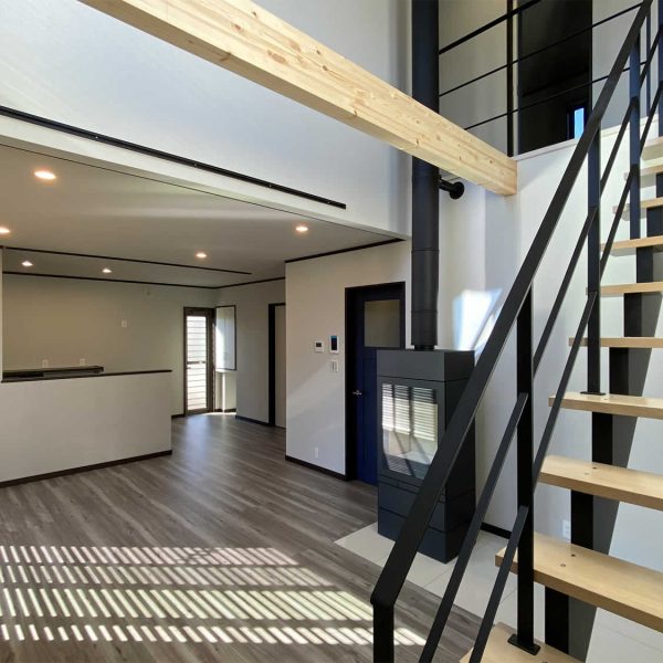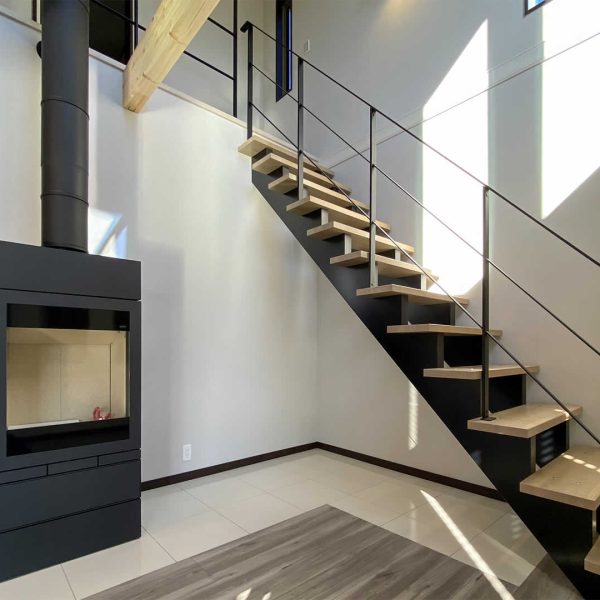 こだわりの詰まったリビングには吹き抜けのオープン階段や暖炉が設置されています。大きな窓からは明るい陽射しが降り注ぐ解放感と暖かみのあるリビングです。