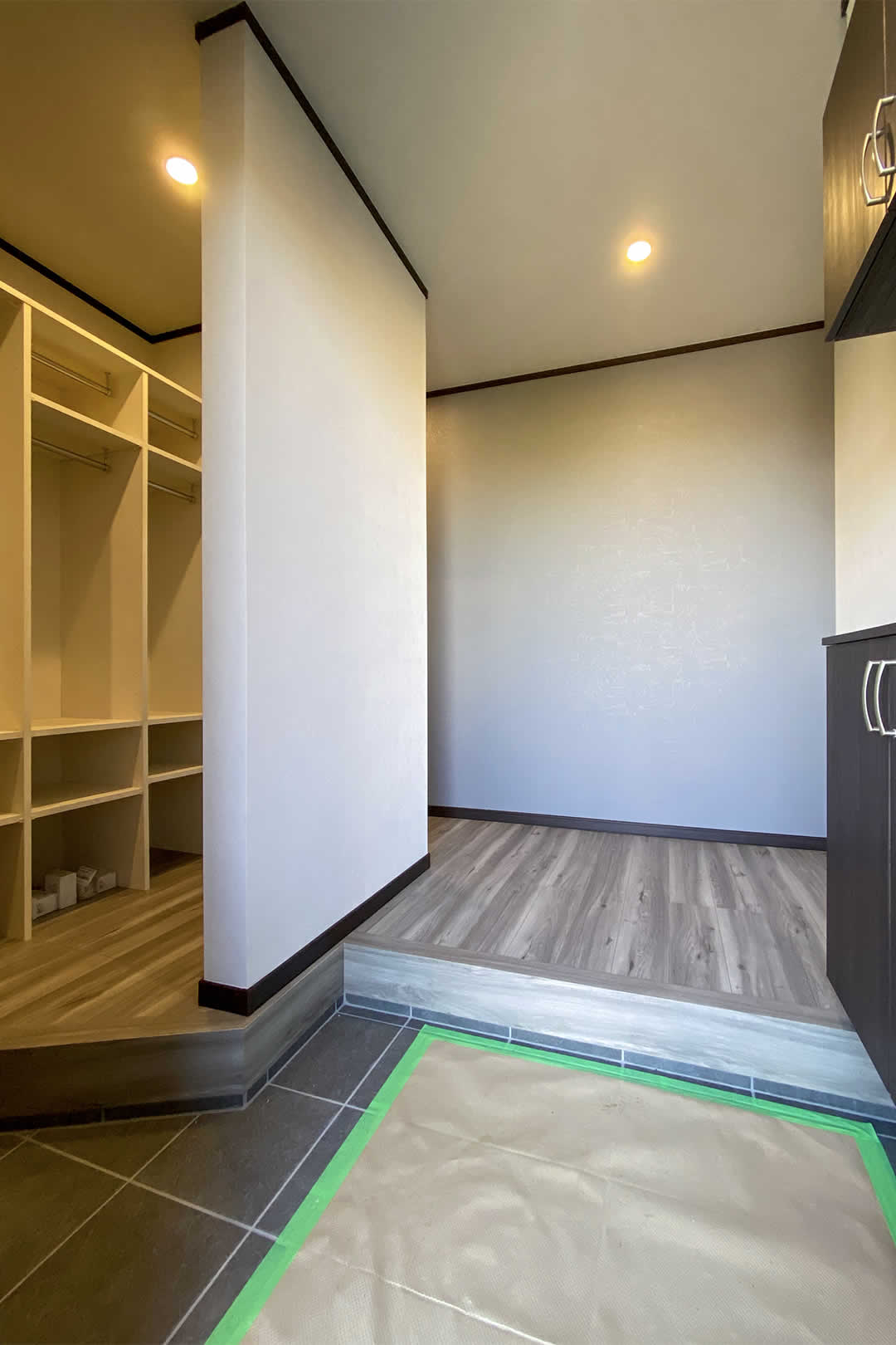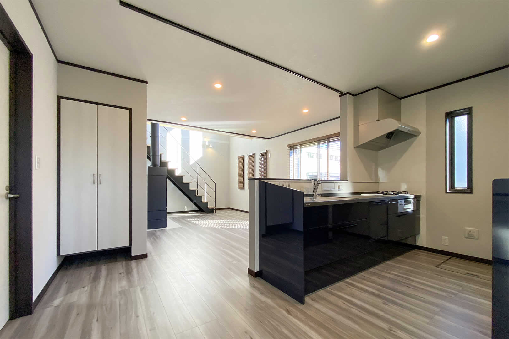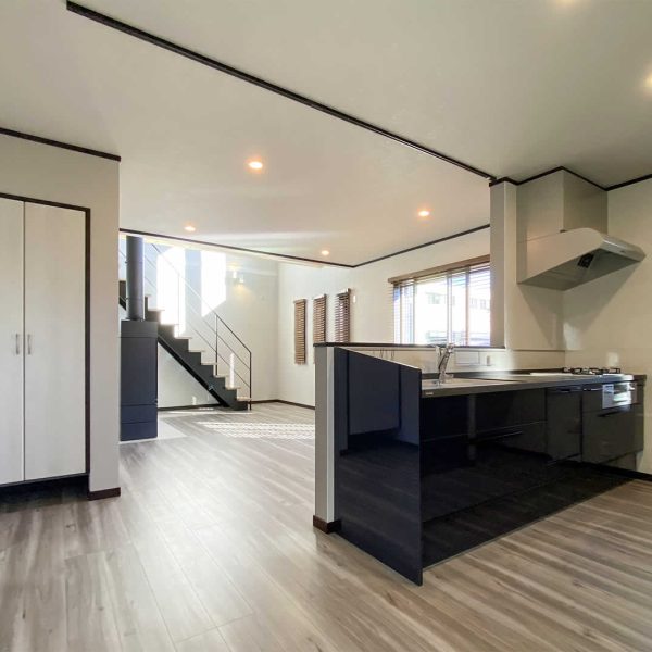 毎日使うキッチンにはパントリー収納・ゴミ箱スペース。近くにはルンバの基地を作り家事や片付けがラクになる工夫が詰め込まれています。
