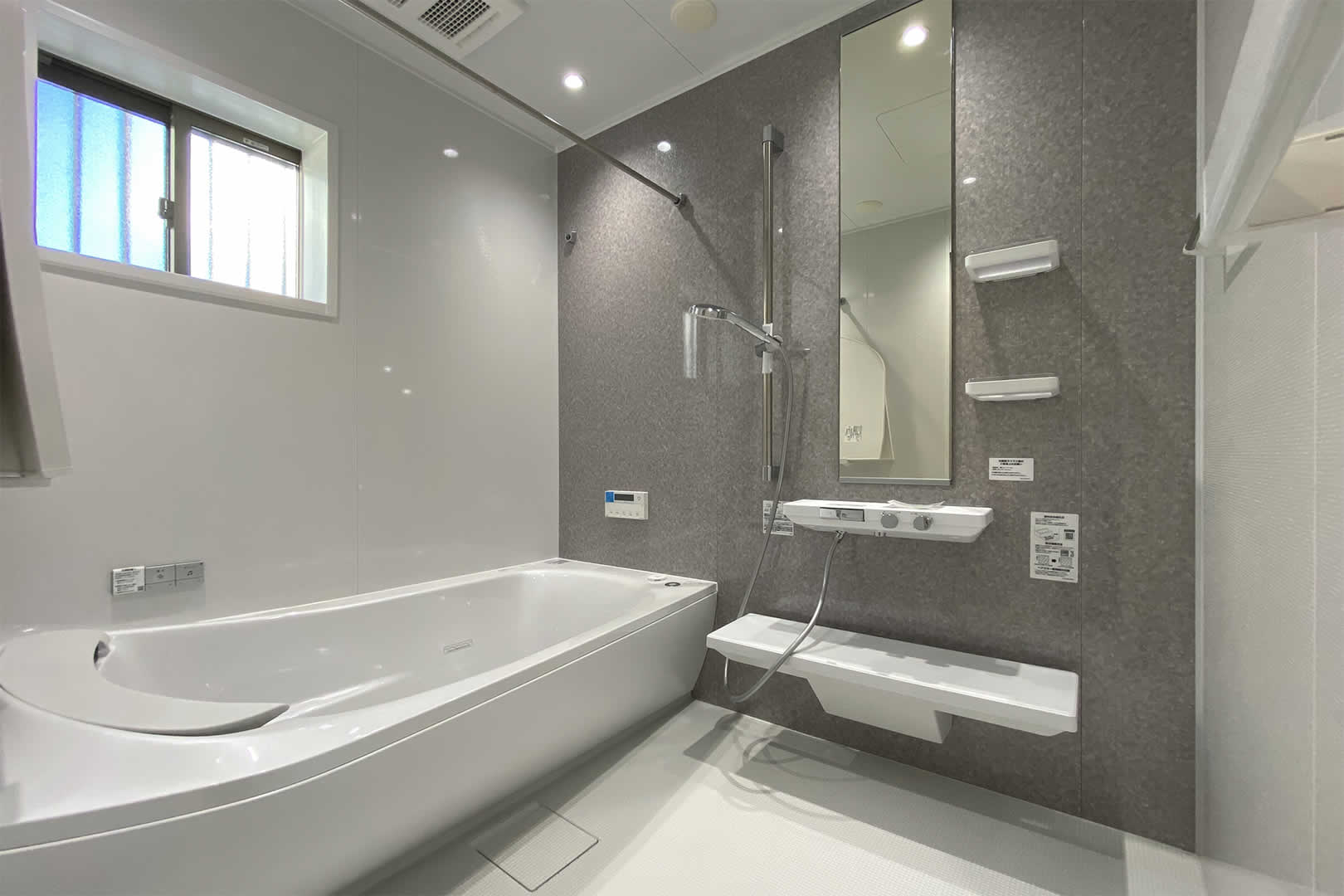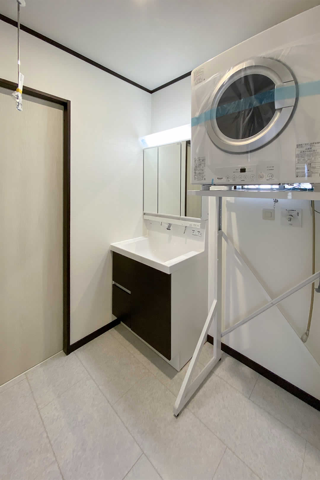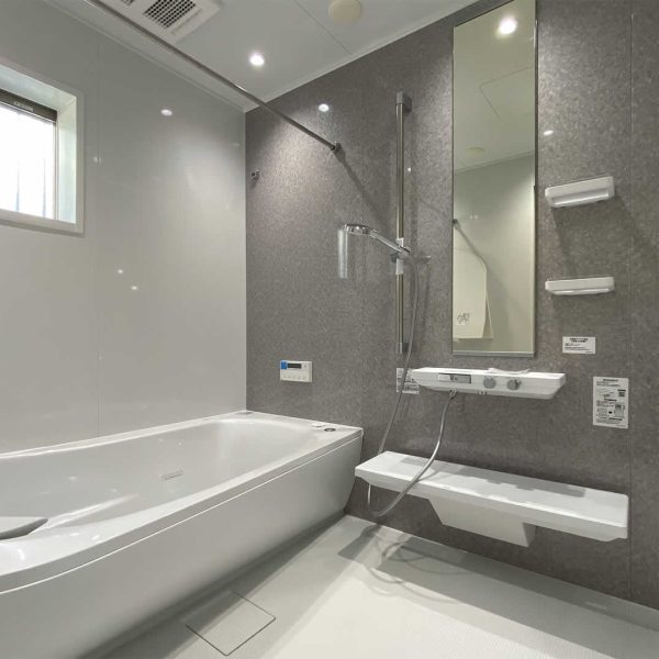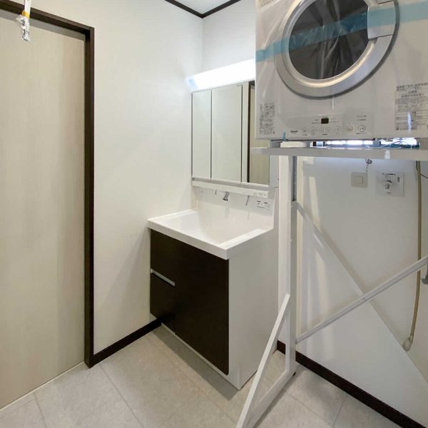 脱衣室にはガス乾燥機の幹太くんを設置してお洗濯の負担を減らします。ゆったりくつろげるお風呂はTOTOのSYNLAを採用。