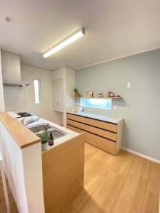 ライトブルーをポイントにしたドアやクロスがとても素敵