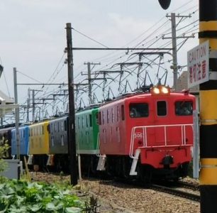 皆様、オリンピックカラーの貨物列車です