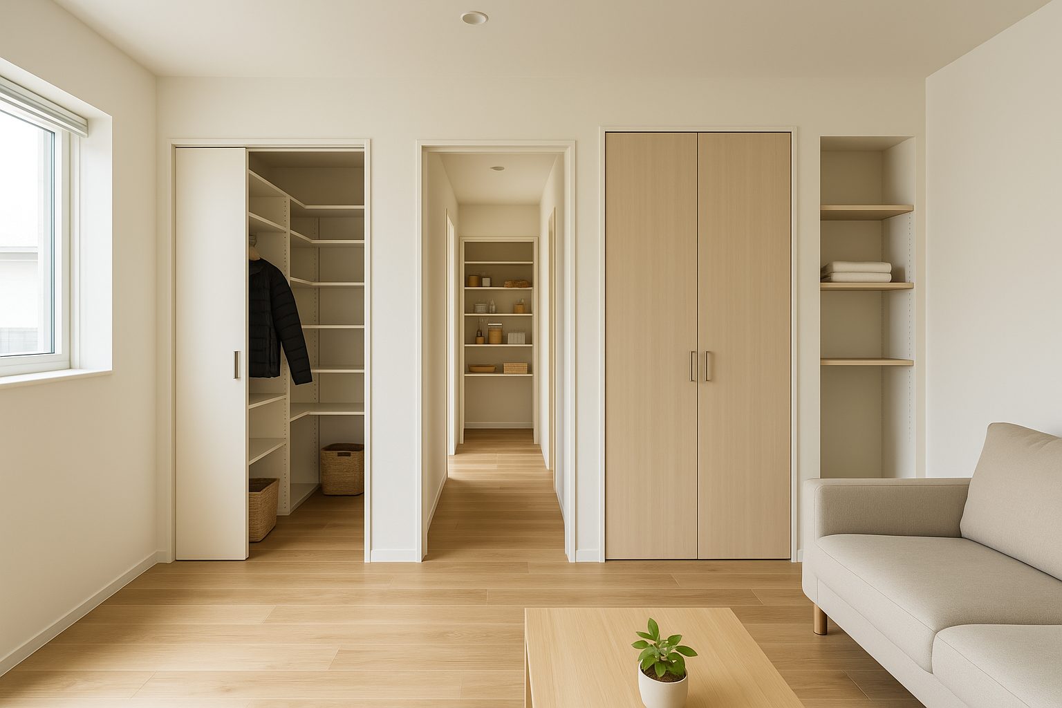 収納力を高めつつ、生活感を抑えるには「見えない場所にしまえる仕組み」が重要です。たとえば玄関横に大型のシューズクロークを設ければ、ベビーカーやアウトドア用品もスッキリ収まります。また、リビング周辺に回遊性のあるウォークスルーパントリーを設けることで、買い置きや日用品がリビングから見えない位置に置けて便利です。これにより、いつでも“モデルハウスのような整った空間”を保つことができます。