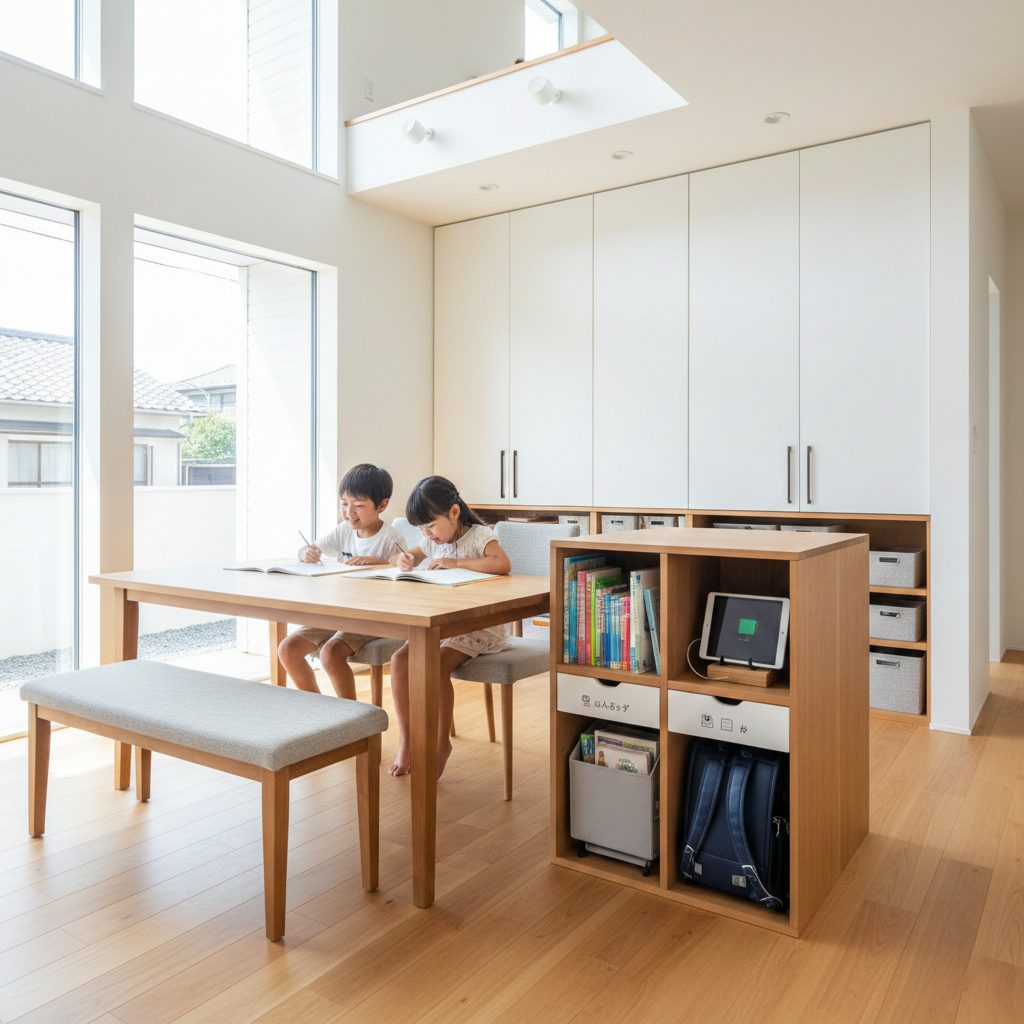 注文住宅なら、学用品収納と動線をセットで計画することで、