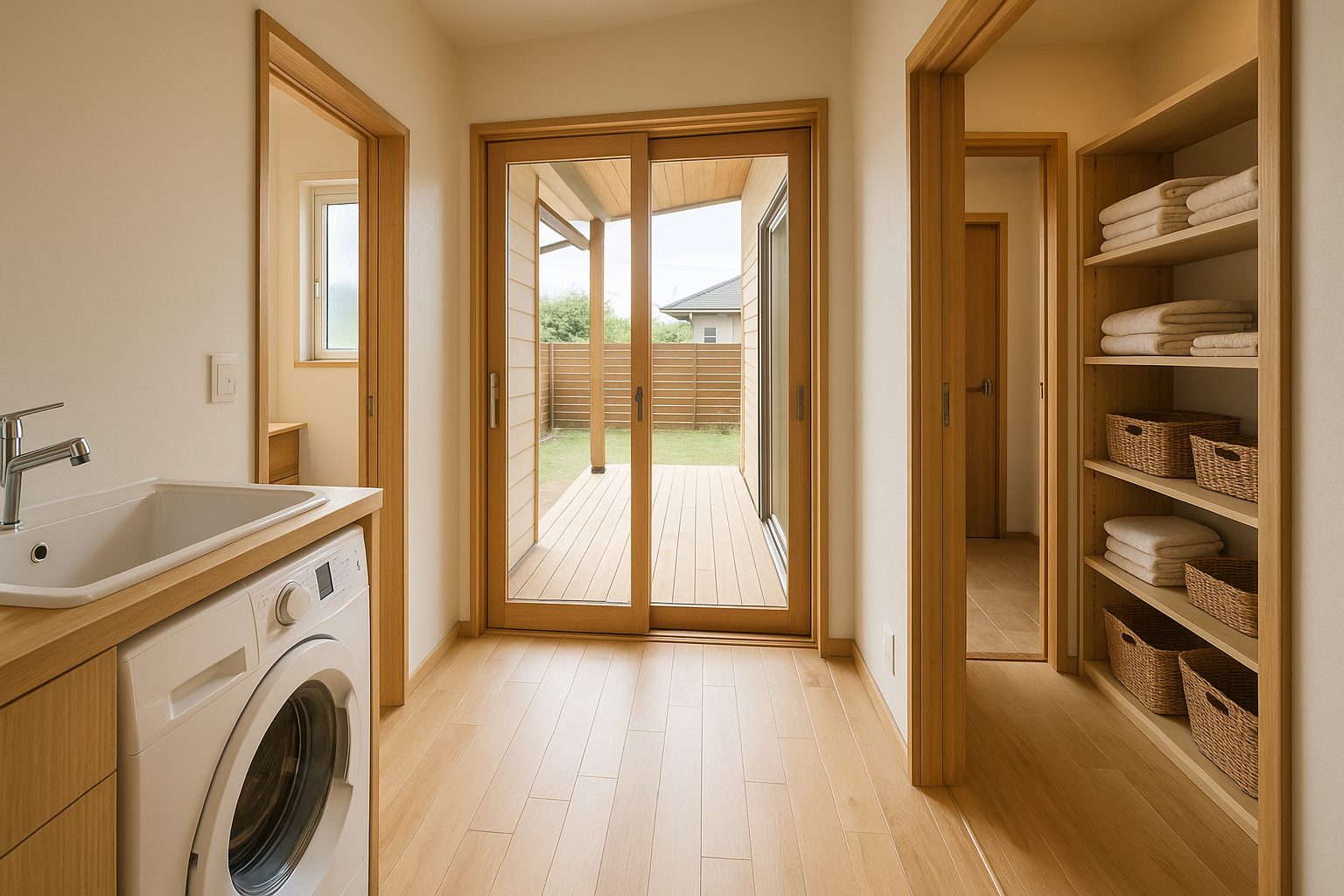 家事ラク平屋の最大のポイントは、「洗濯動線」。洗面室から勝手口→ウッドデッキ→室内収納へと一直線につながる間取りなら、洗濯物を運ぶ距離がほぼゼロに。