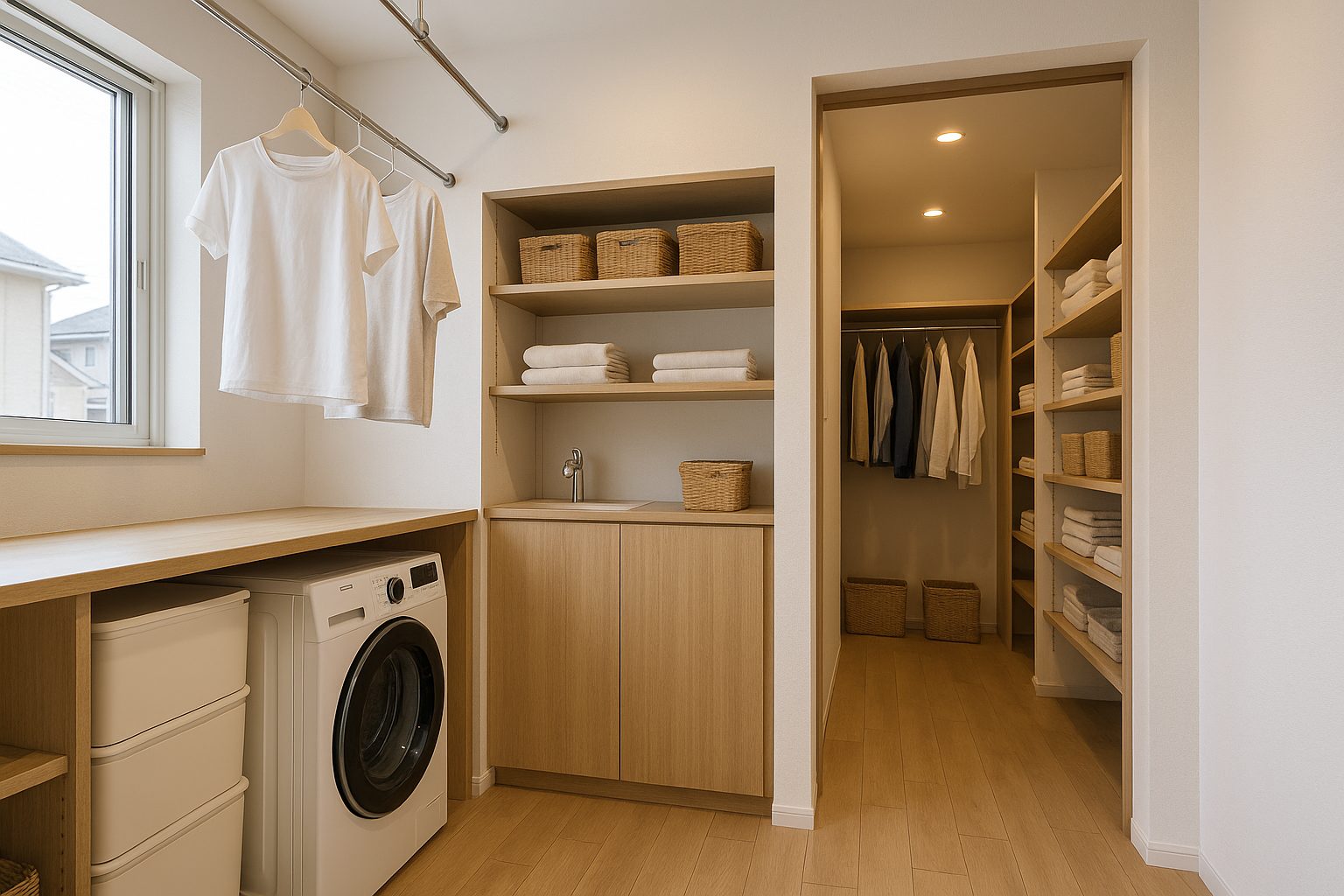 この配置なら、洗濯物を干してその場でたたんで、すぐにしまえる。2階に運ぶ必要もなく、移動が劇的に減ります。収納棚をオープン仕様にすれば、出し入れもスムーズで、家族みんなが使いやすい空間になりますよ。