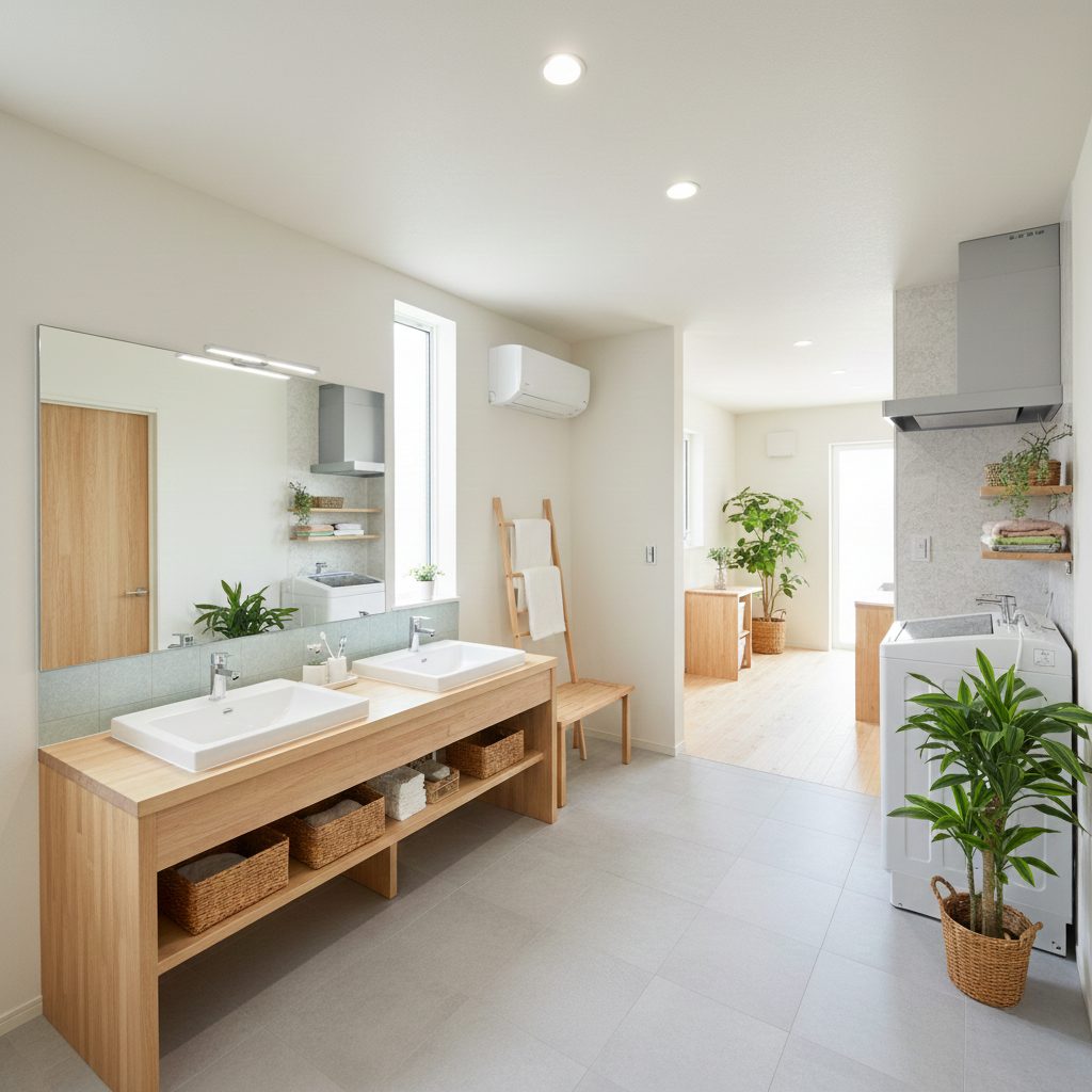 洗面と脱衣を分けることで、動線が自然に分散し、生活リズムの違いも吸収できます。注文住宅なら、廊下を兼ねた設計もしやすいです。