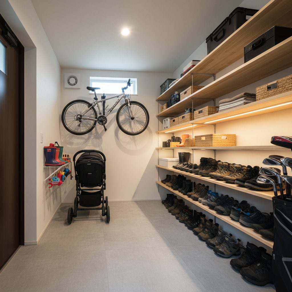 土間収納の魅力は、その収納力だけではありません。ご家庭のライフスタイルに合わせて、様々な使い方ができる柔軟性も持ち合わせています。 例えば、アウトドアが趣味のご家庭なら、キャンプ用品や釣り道具の手入れをするスペースとして活用できます。汚れた道具をそのまま持ち込めるので、室内に汚れを持ち込む心配もありません。小さなお子さんがいるご家庭なら、ベビーカーや三輪車、外遊び用のおもちゃをサッとしまえるので、玄関が散らかるのを防げます。また、ペットを飼っているご家庭では、散歩グッズやリード、一時的な足洗い場として使うことも可能です。注文住宅だからこそ、ご自身の「あったらいいな」を形にできるのが土間収納の醍醐味と言えるでしょう。