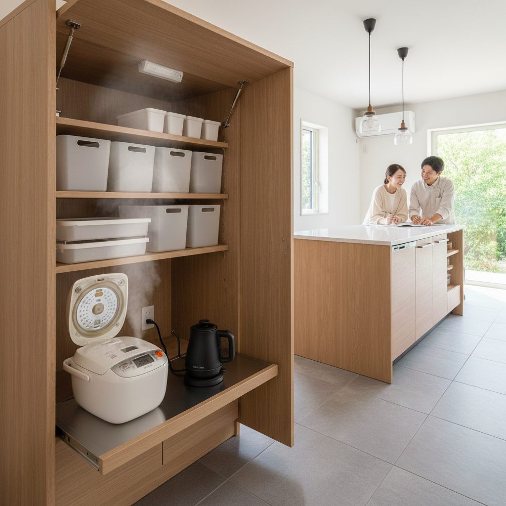「背面収納を作ったのに、使ってみたら棚がベタつく…」「炊飯器の蒸気で扉が反ってしまった」そんな後悔の声、実は少なくありません。見た目スッキリの家電収納は、注文住宅で人気の仕様ですが、蒸気対策を怠ると劣化やカビ、匂いの原因に。そこで今回は、埼玉で家づくり中の方へ向け、背面収納で失敗しないポイントを紹介します。収納の計画は完成後に変えにくいので、最初から対策しておくと安心です。