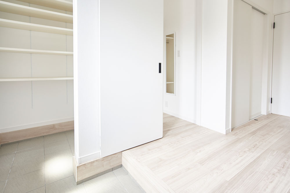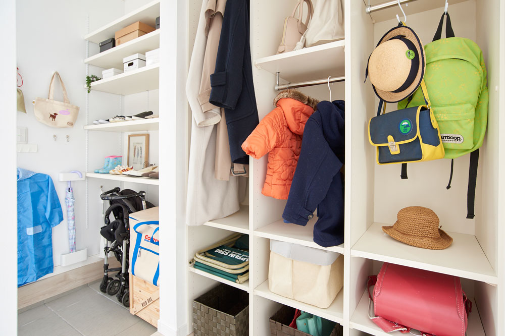 ベビーカーや雨具、趣味の道具など外で使用した物がそのまま収納できるのが土間収納の魅力。おかげで玄関はいつもスッキリ!!