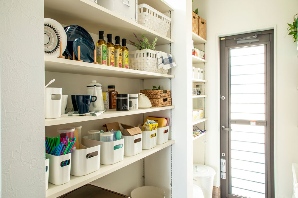 置く場所に困るストック食品やキッチン用品をしっかりしまえます。下にはゴミ箱がすっぽりと納まるように設計しました。4