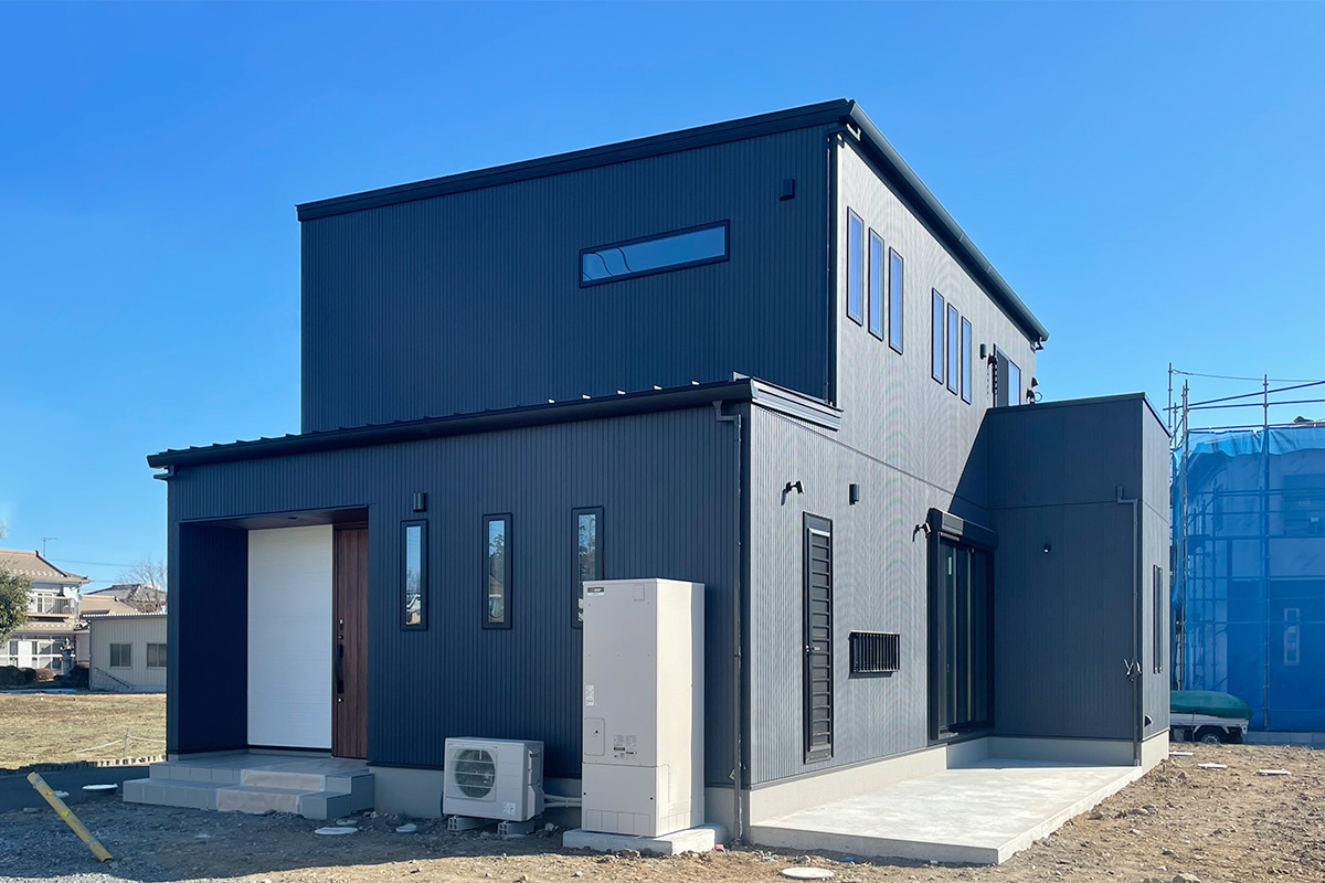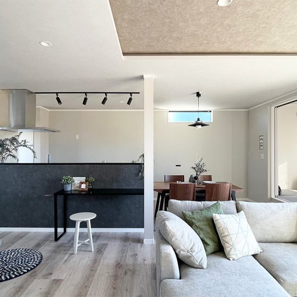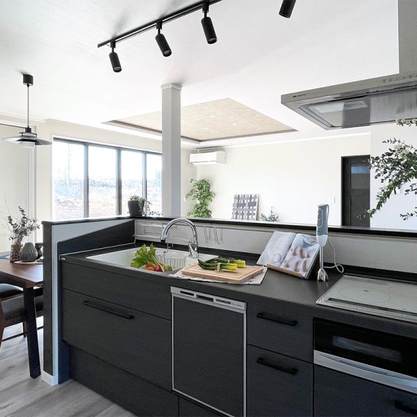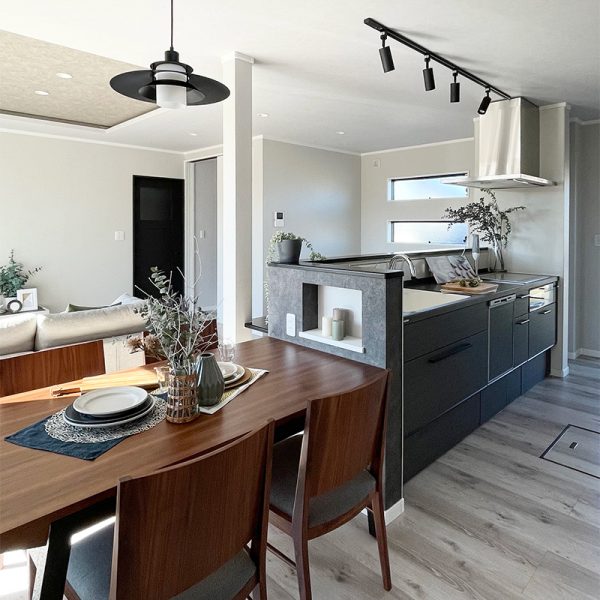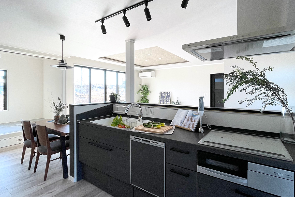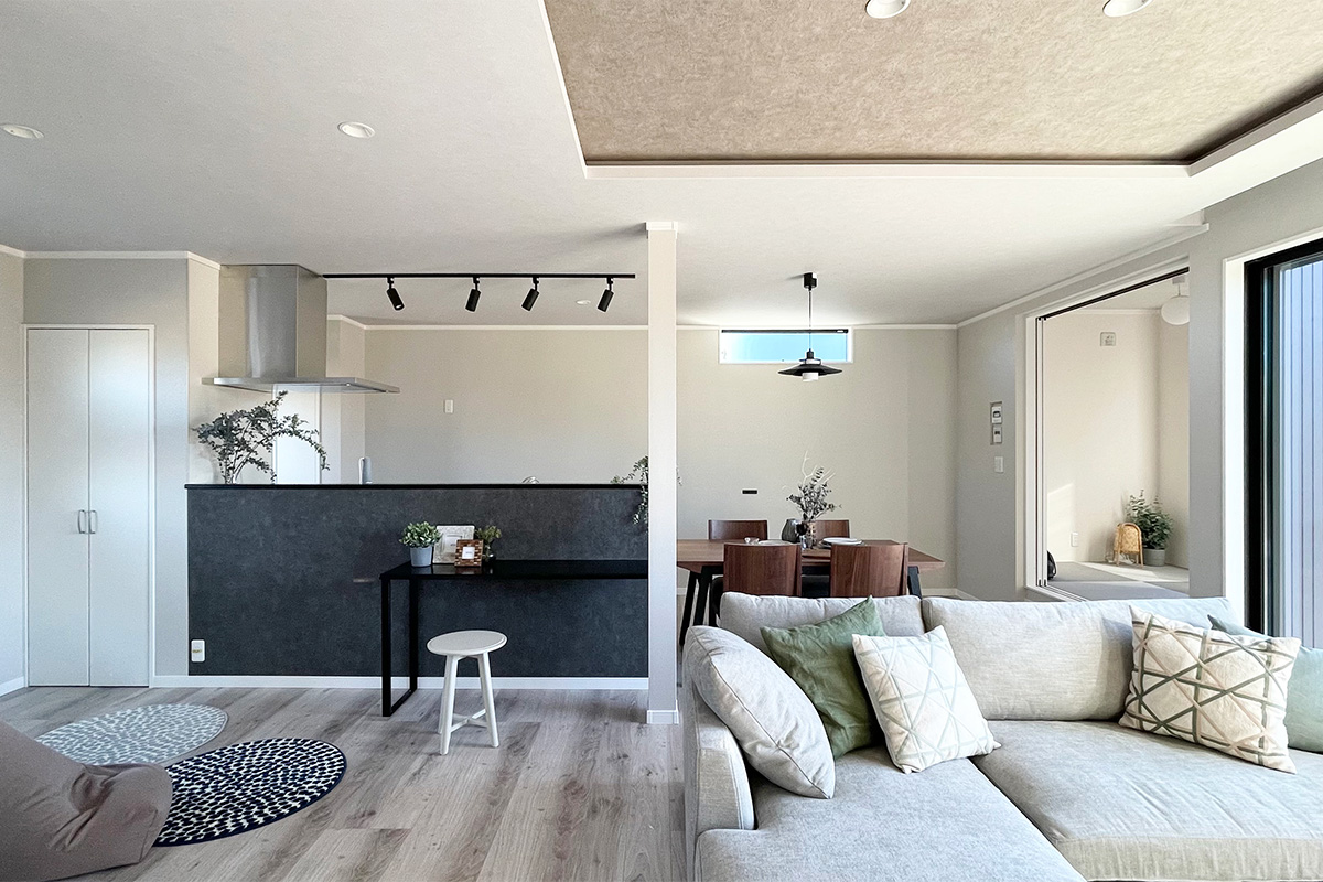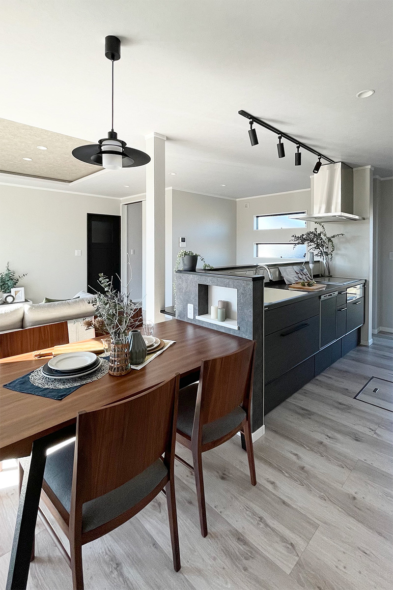リビングに入るとまず目に入るのはキッチンダイニング。キッチンとダイニングの繋がりを大切に、ダイニングに集まる家になっています。