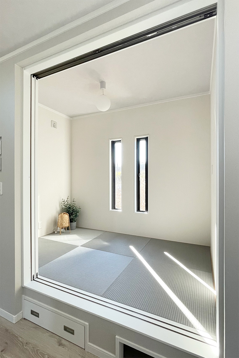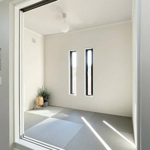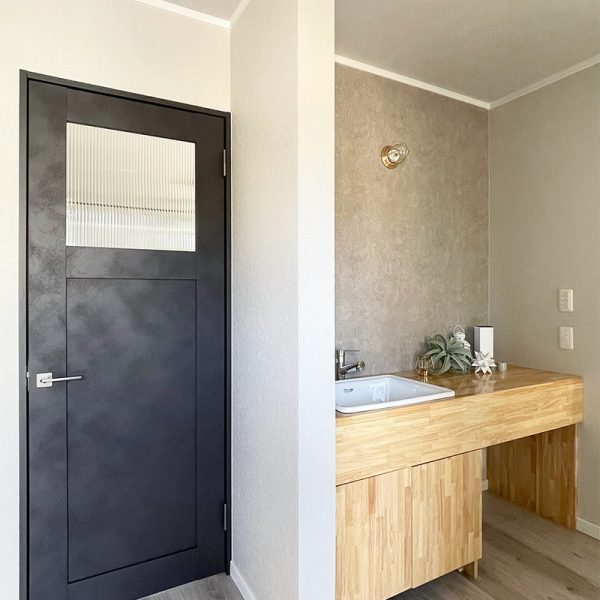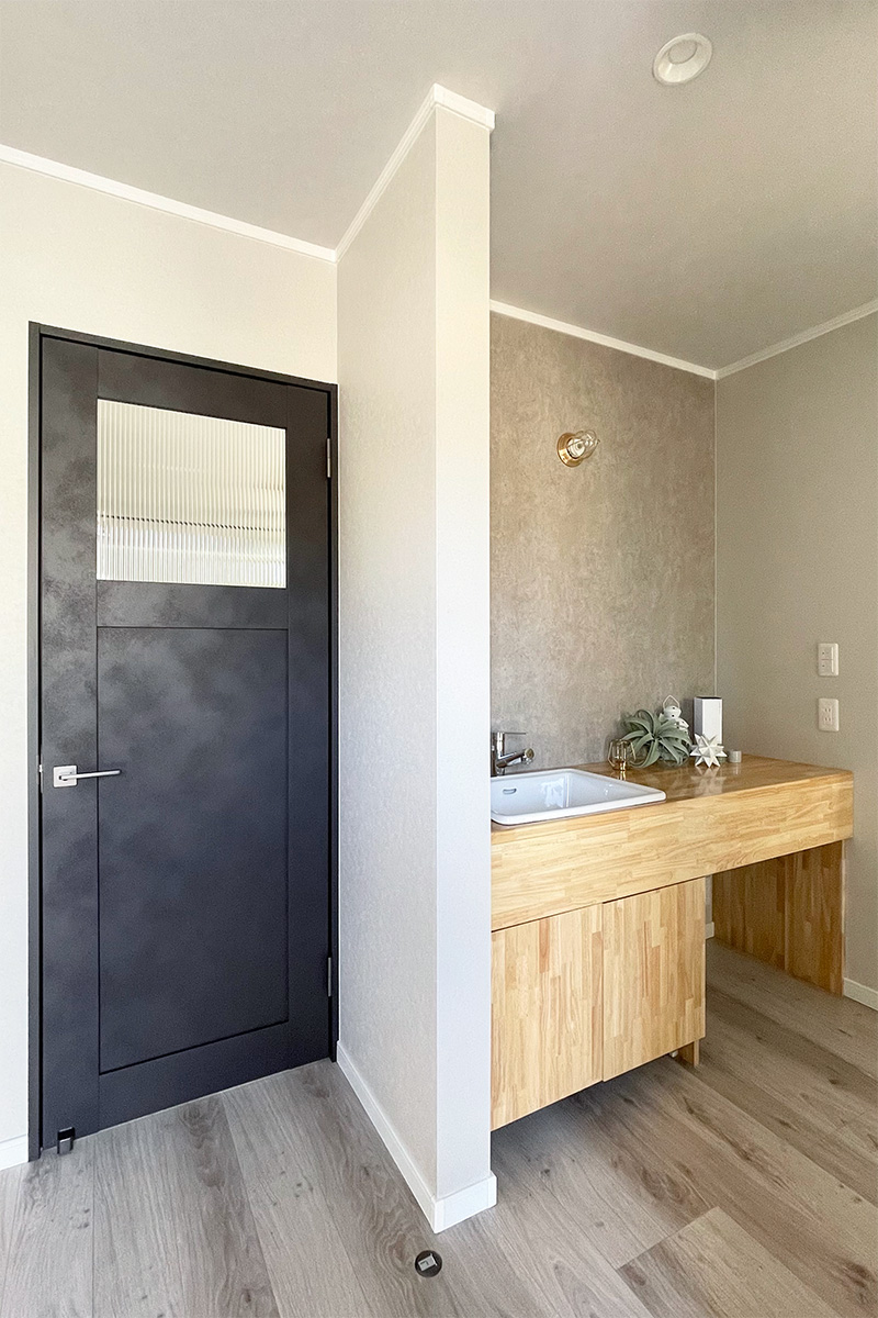 玄関に入ってすぐに独立洗面台。コロナウイルスの流行から玄関の近くに洗面を設ける方が増えています。家族の安心が考えられています。