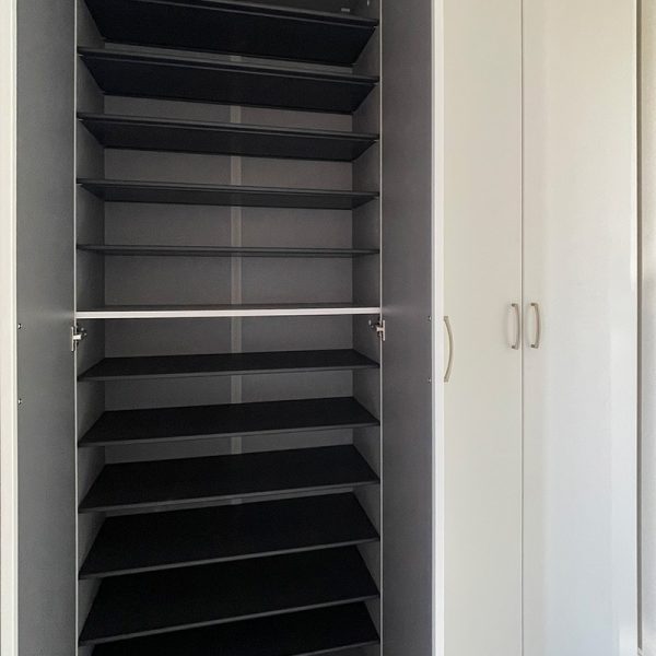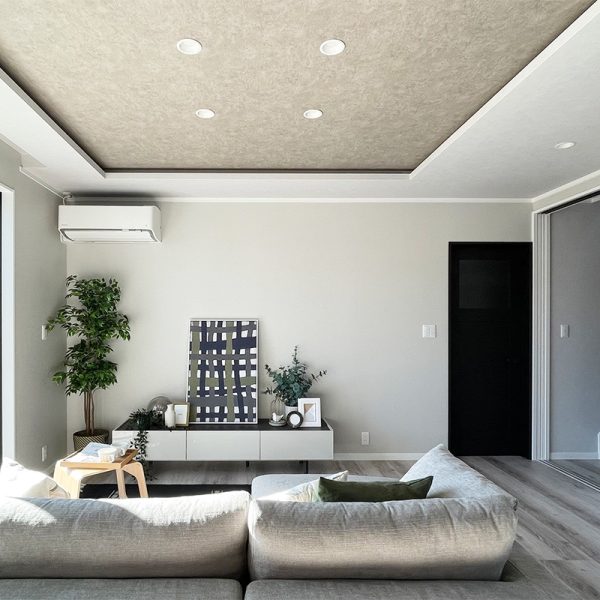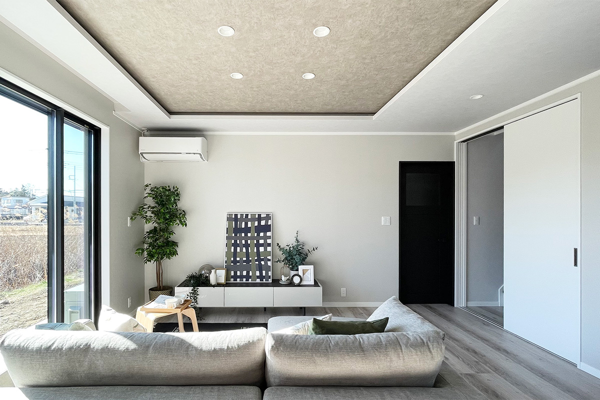 全体的なトーンをグレーにして落ち着いた空間。でありながら、織り上げ天井と大きな窓で解放感を出しました。