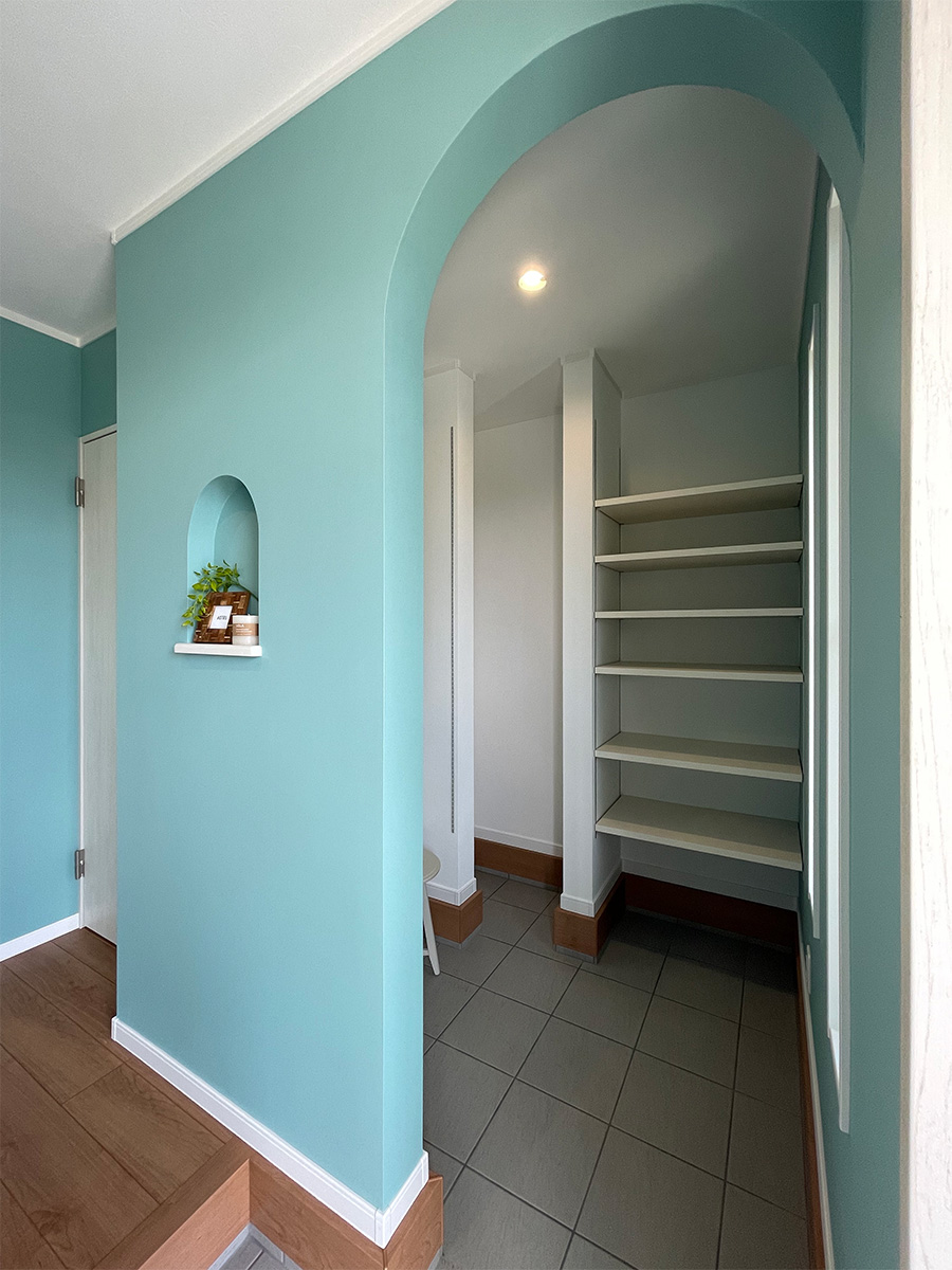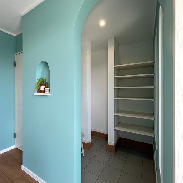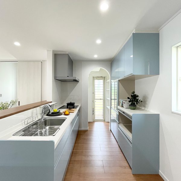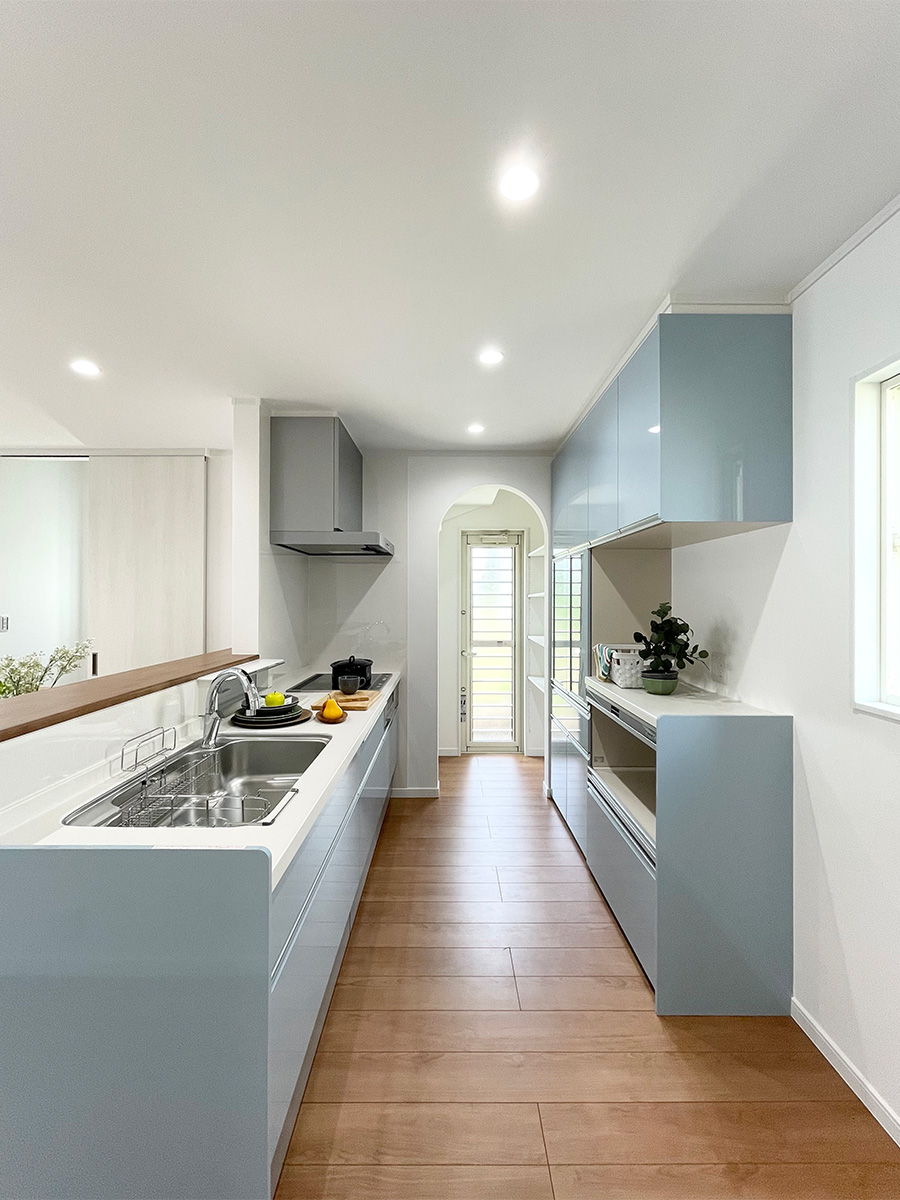 外観に合わせて水色のキッチンを選び、アーチ型の垂れ壁でかわいらしいパントリーの入り口にしました。