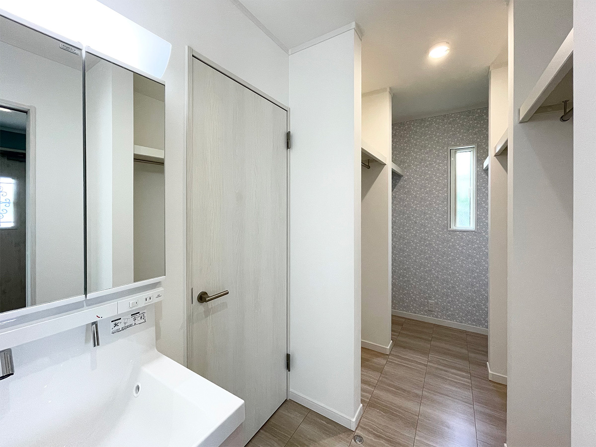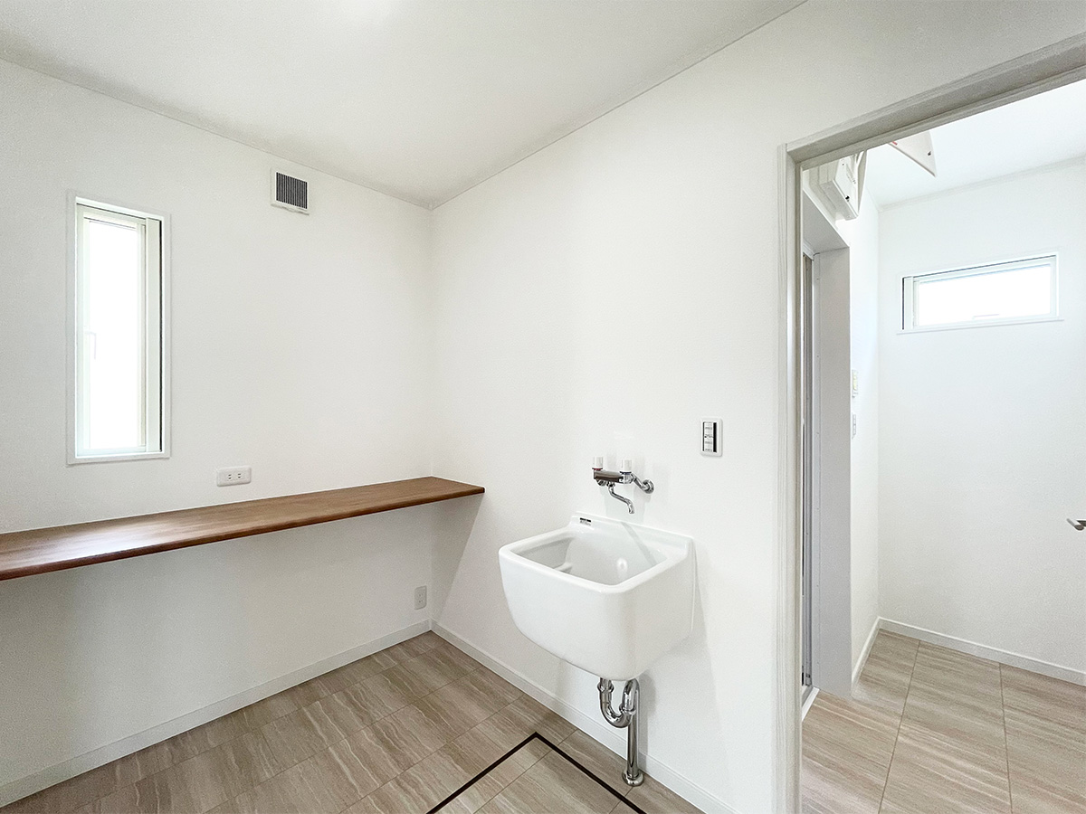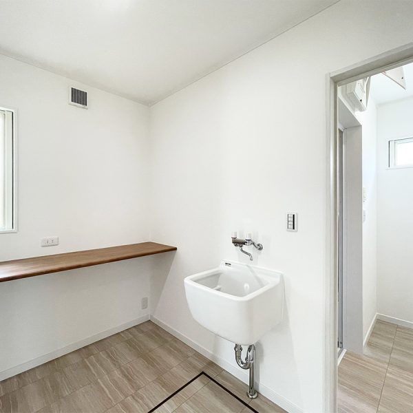 洗面所には、お子様が部活で汚れた洗濯物を持ち帰ってきたり、ご主人の作業着などつけ置き用に便利な深型タイプの洗面台を付けています。