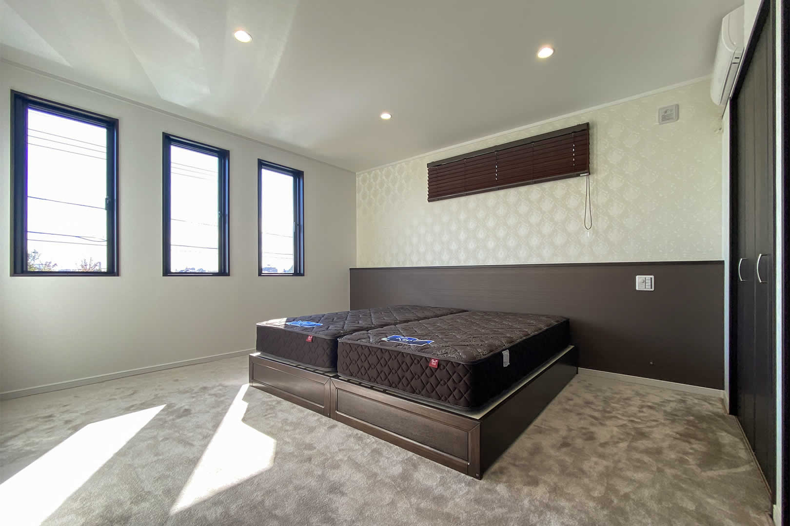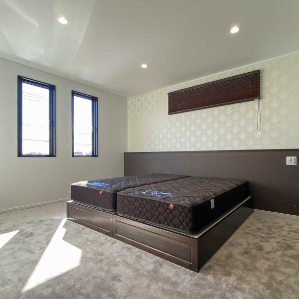寝室はカーペットを敷き込みホテルのような空間に。