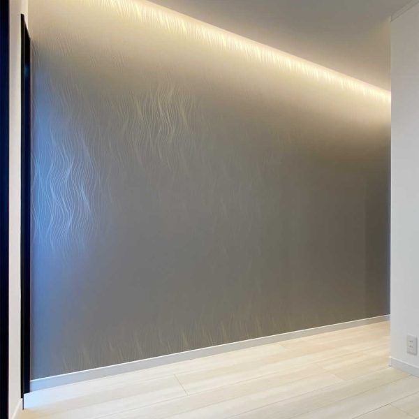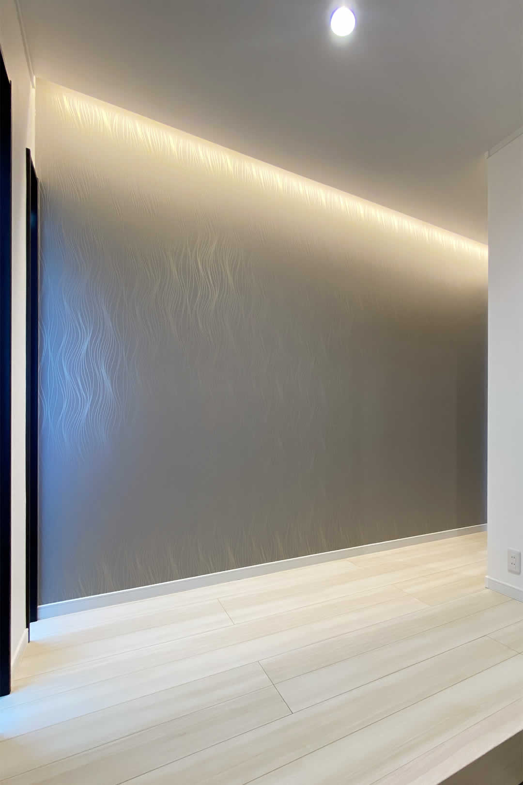 玄関ホールは間接照明とアクセントクロスでスタイリッシュな空間に。