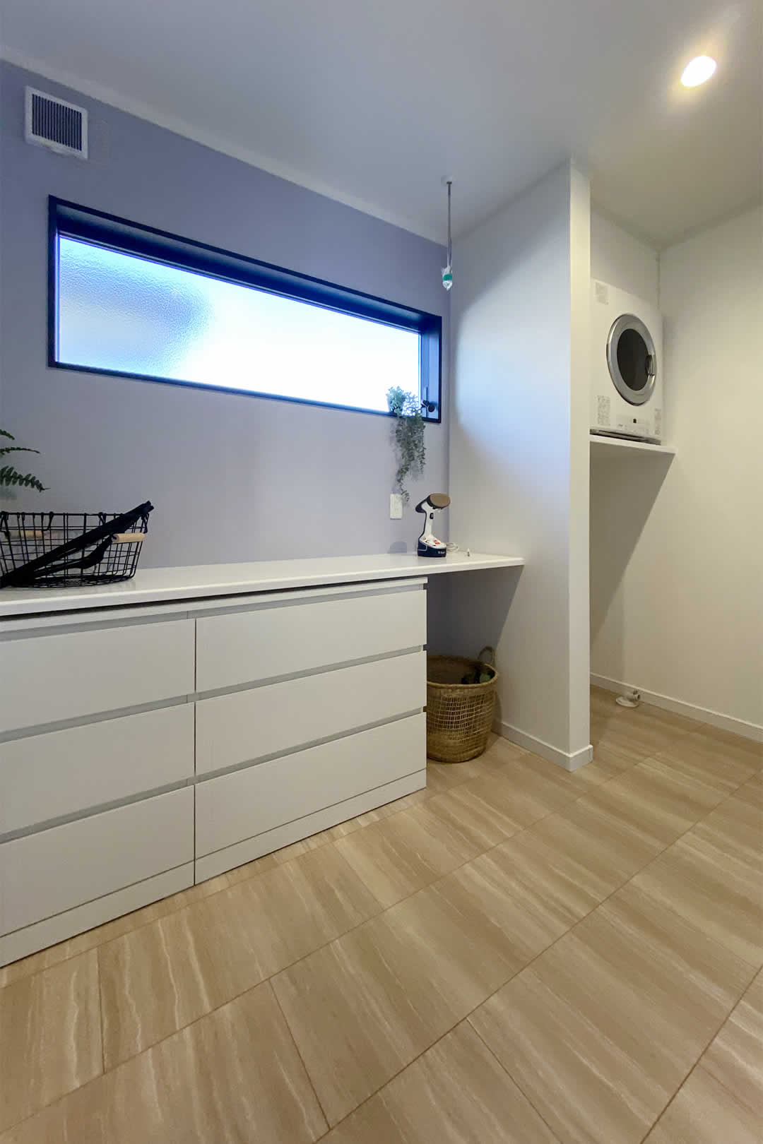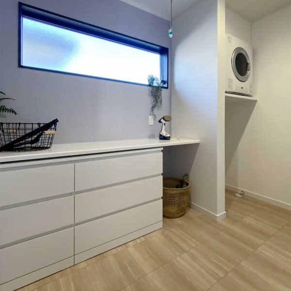 ランドリールームでは洗濯物を洗う、干す、たたむ、しまう全ての作業ができるスペースになっていますので家事効率が上がります。ガス乾燥機の幹太くんは洗濯物が約45分で乾く、採用率がUPしている人気商品です。