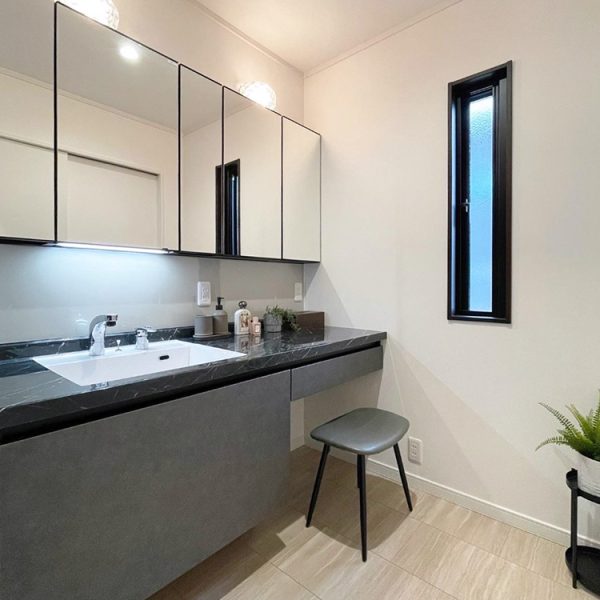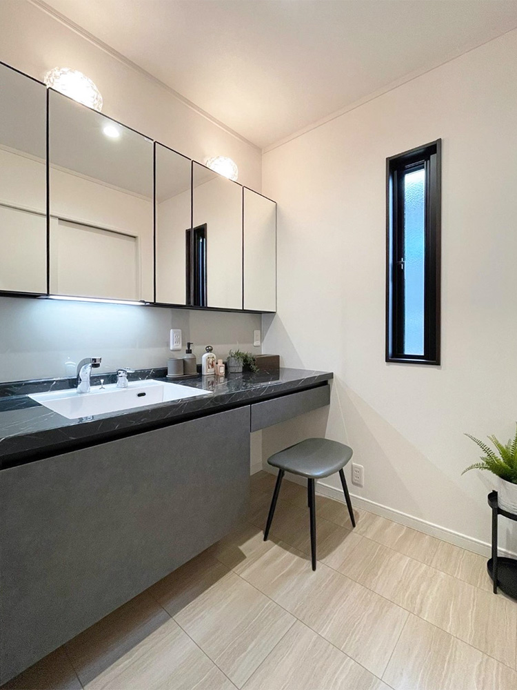 ミラー下はワンポイントで色を変えてラグジュアリーな洗面空間ができました。