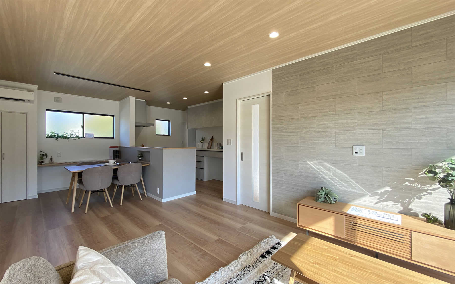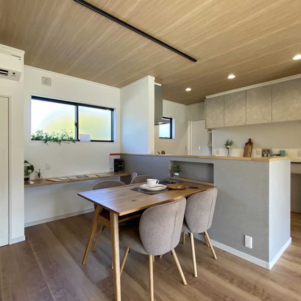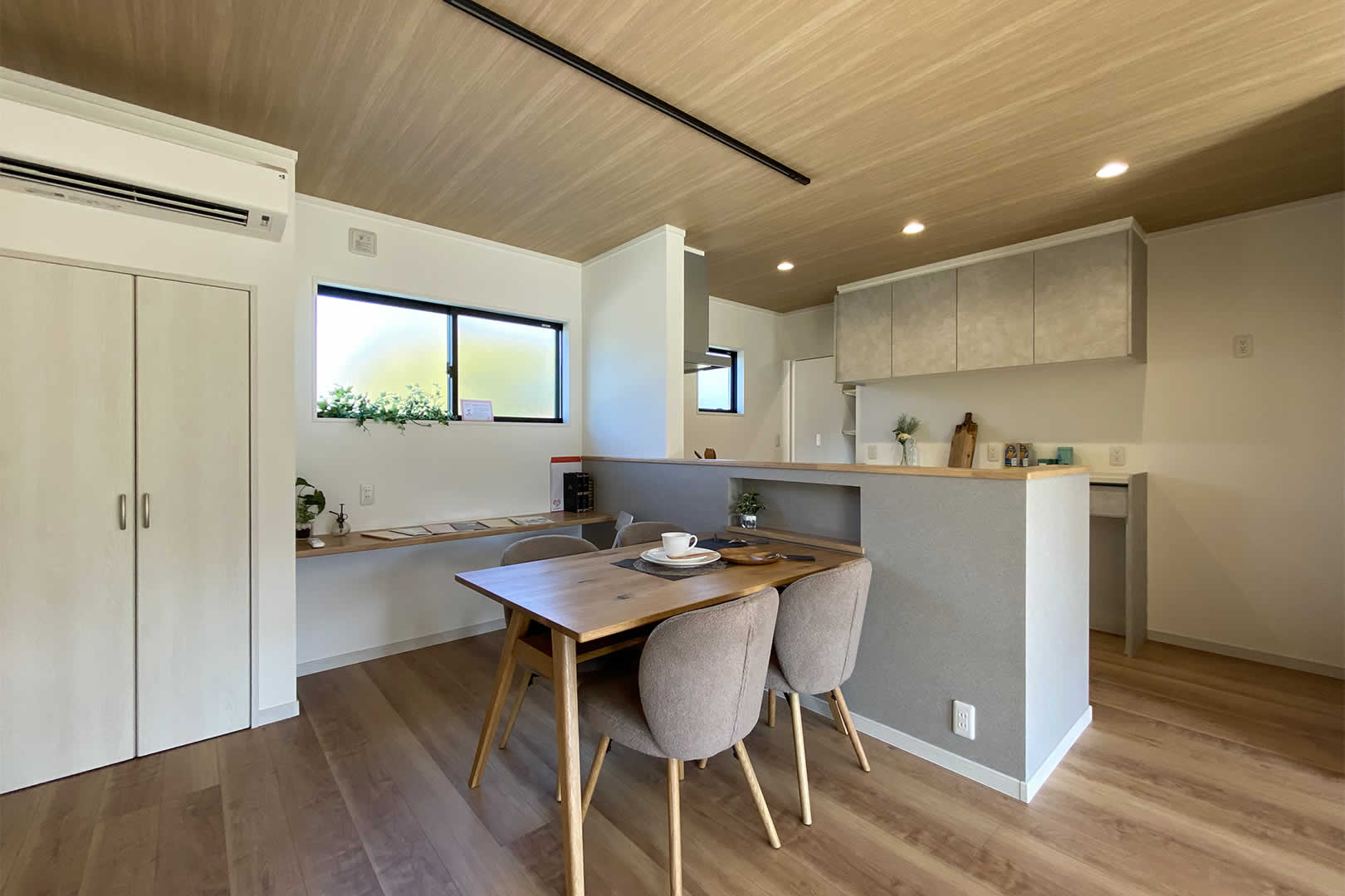 スタディカウンター付きのリビングで、お子様の宿題をするなど暮らしに合わせてアレンジできるスペースです。ナチュラルな木目調の床が映える広々したリビングです。