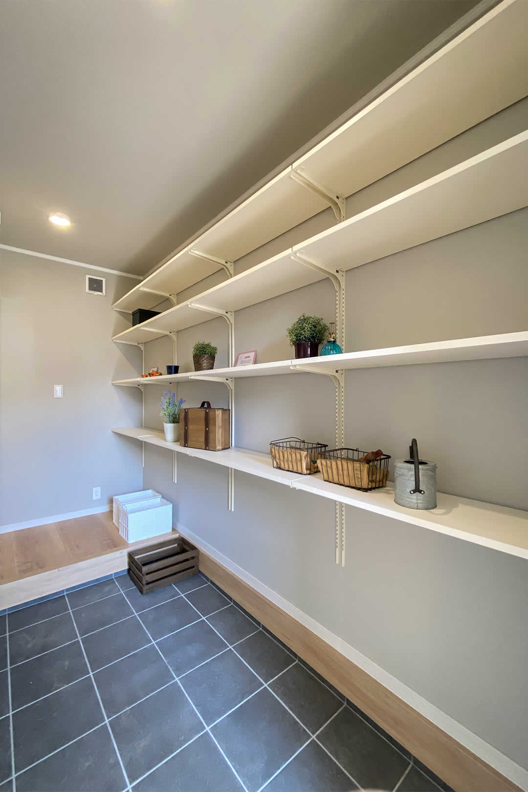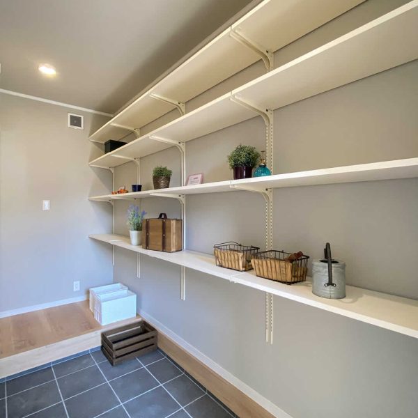 玄関→土間収納→パントリー→キッチンと動線がつながっているので、買い物した食品などを運ぶのと収納するのが楽です。