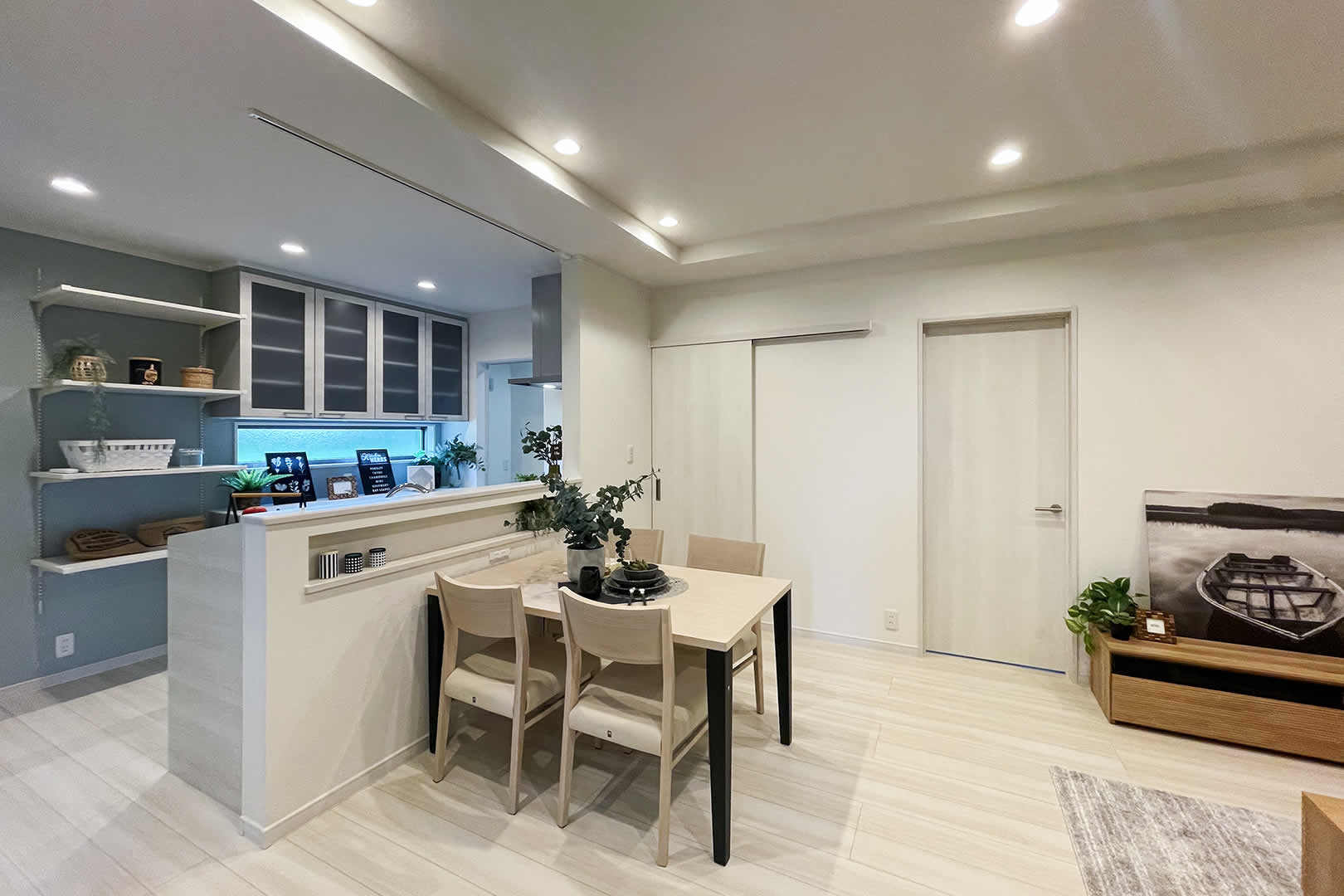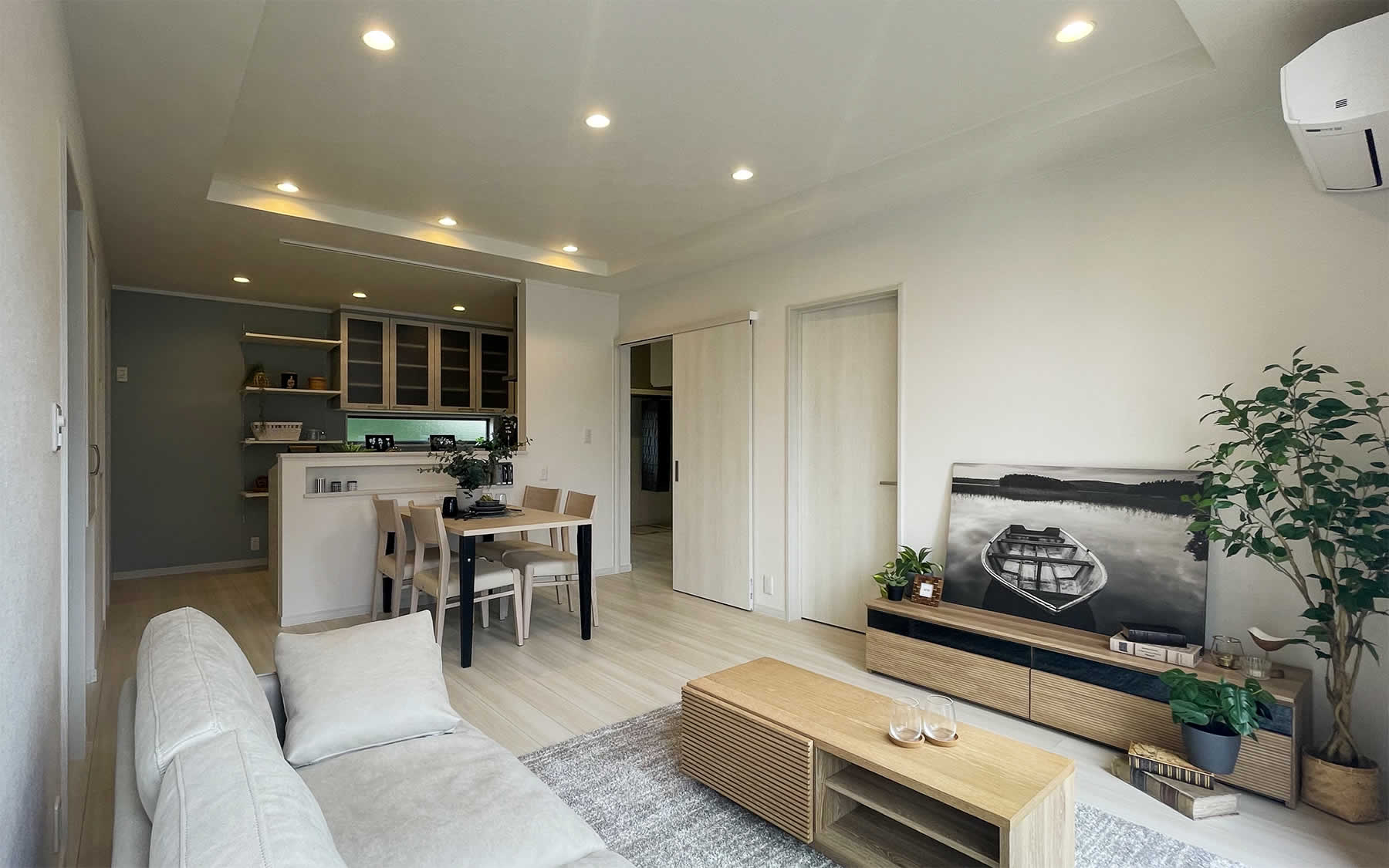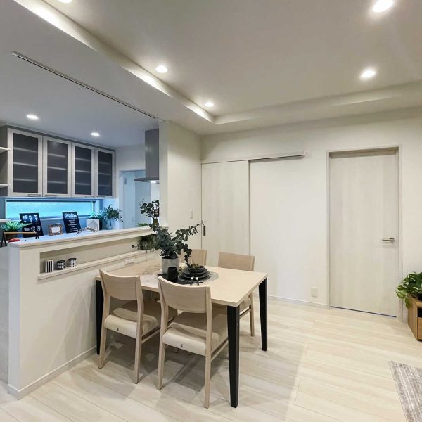 白の木目調の床が映える広々としたLDK。天井が一部高くなっているのでより一層開放的な空間になっています。