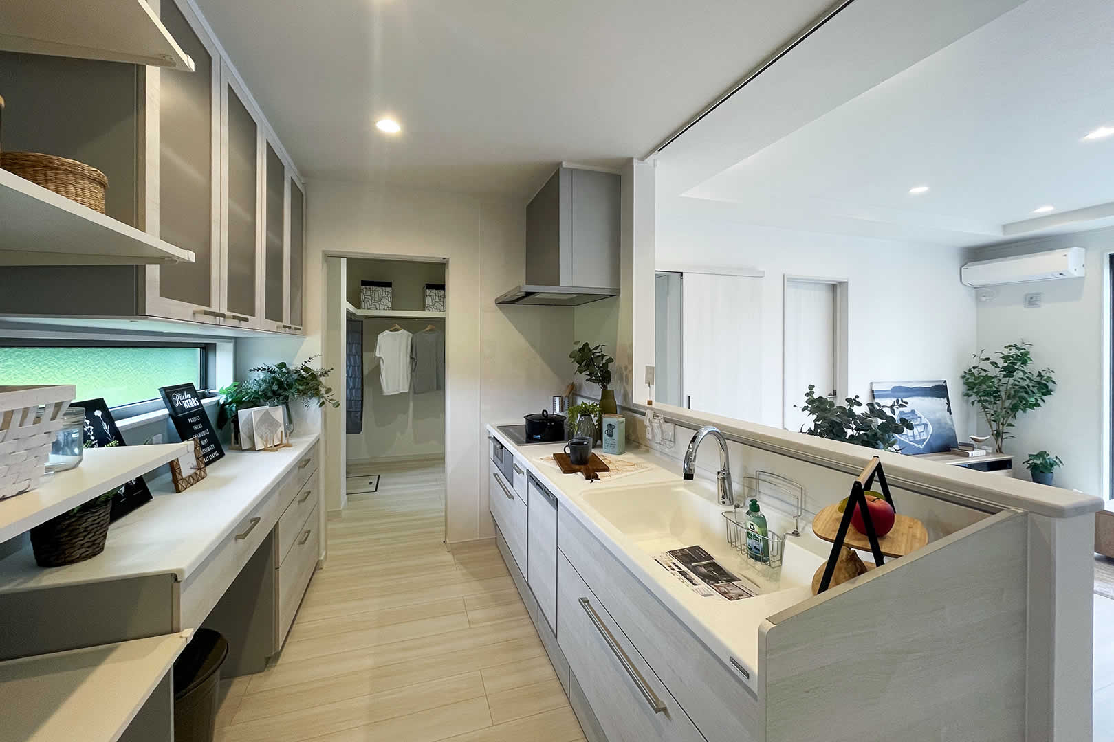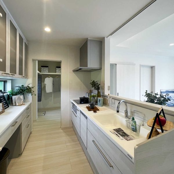 タッチレス水栓を採用しており、洗い物を楽にする事ができます。また食器棚の隣に、可動棚(動かせる棚)をつける事により収納力アップと小物を飾る事によりオシャレ感もアップします。