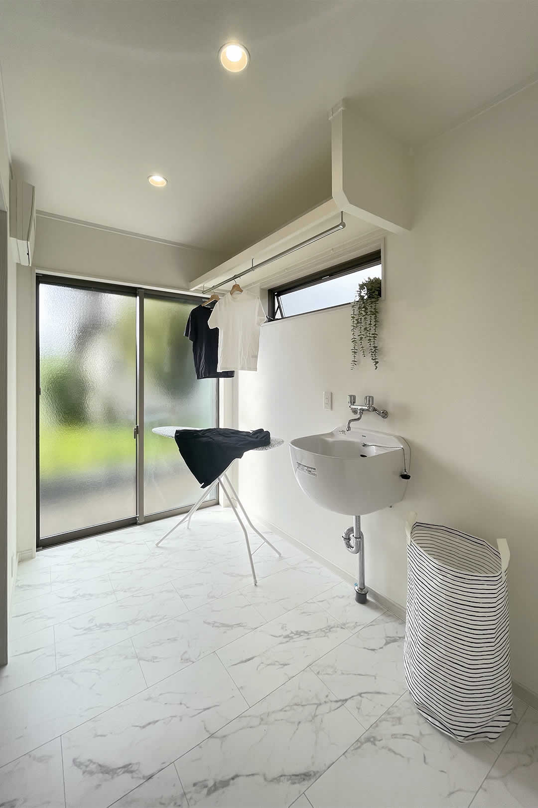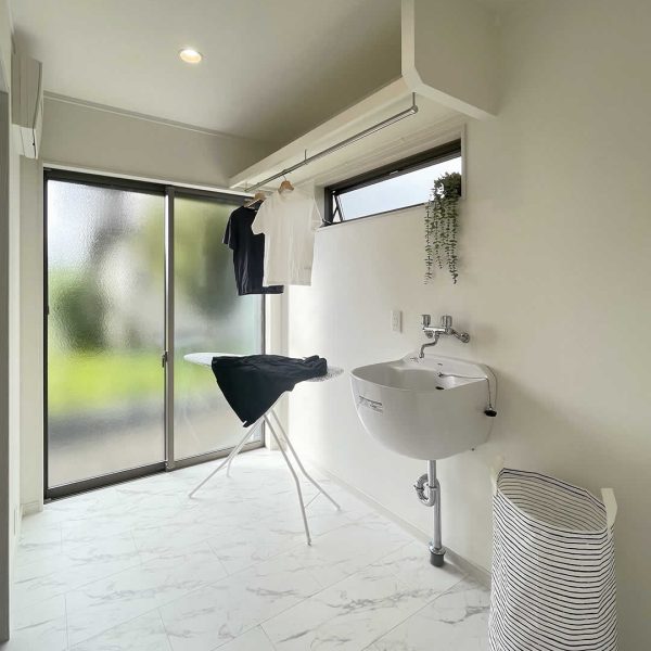 スロップシンク付きのランドリールーム。物干しがついておりますので洗濯物をして、そのまま物干しへ。一つの空間で洗濯から干すまで出来るので家事軽減になります。