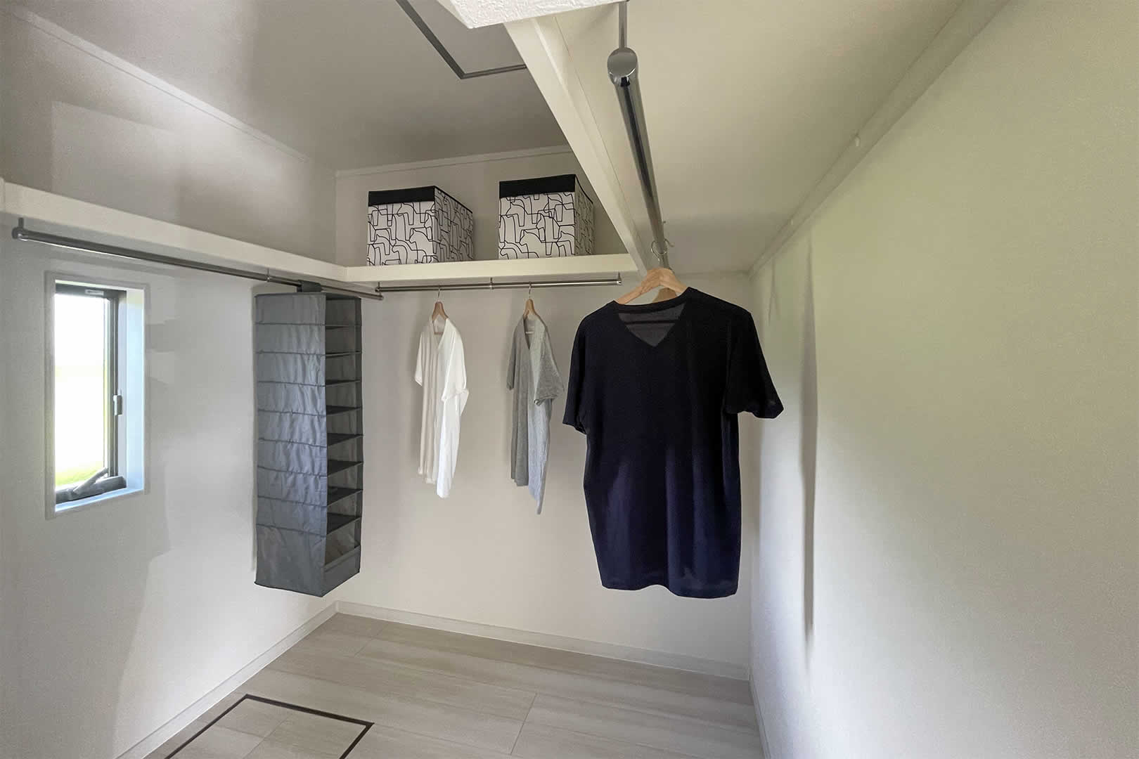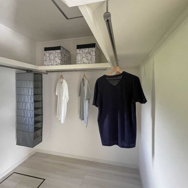 約3帖のファミリークローゼット、動かせる棚とパイプ付きの棚がありご家族の皆様に合わせて収納出来ます。また1階にある事によって、生活動線も短縮でき日々のストレスが軽減されます。