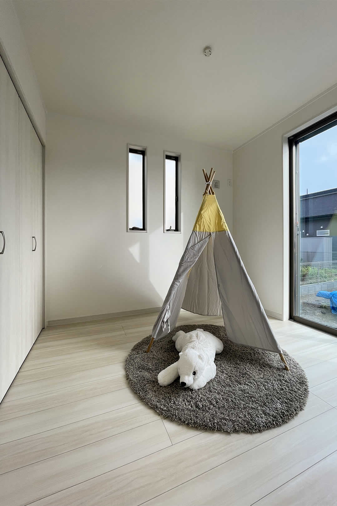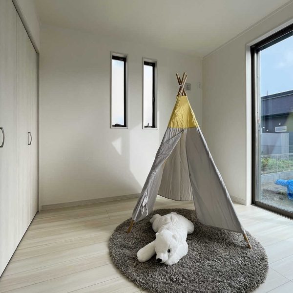 収納の扉を無くす事により室内が広く見える工夫になるのと、子供の成長に合わせてお部屋のカスタマイズができて長く有効的に使える部屋になります。