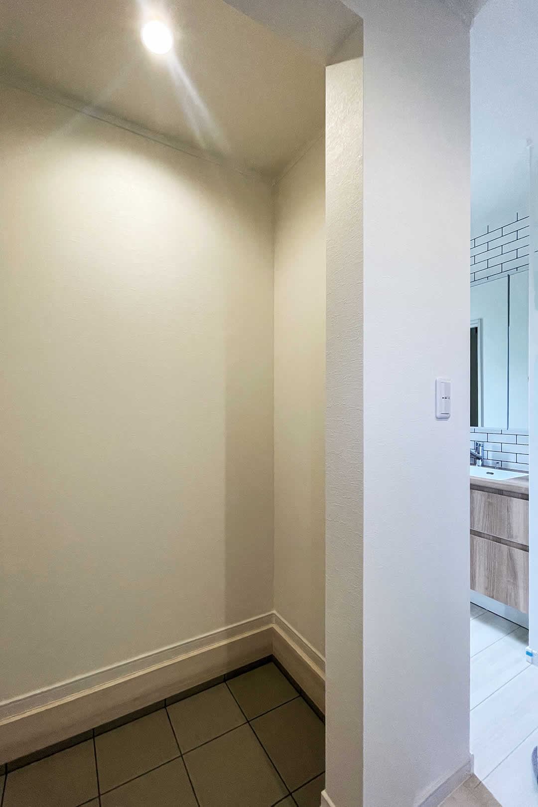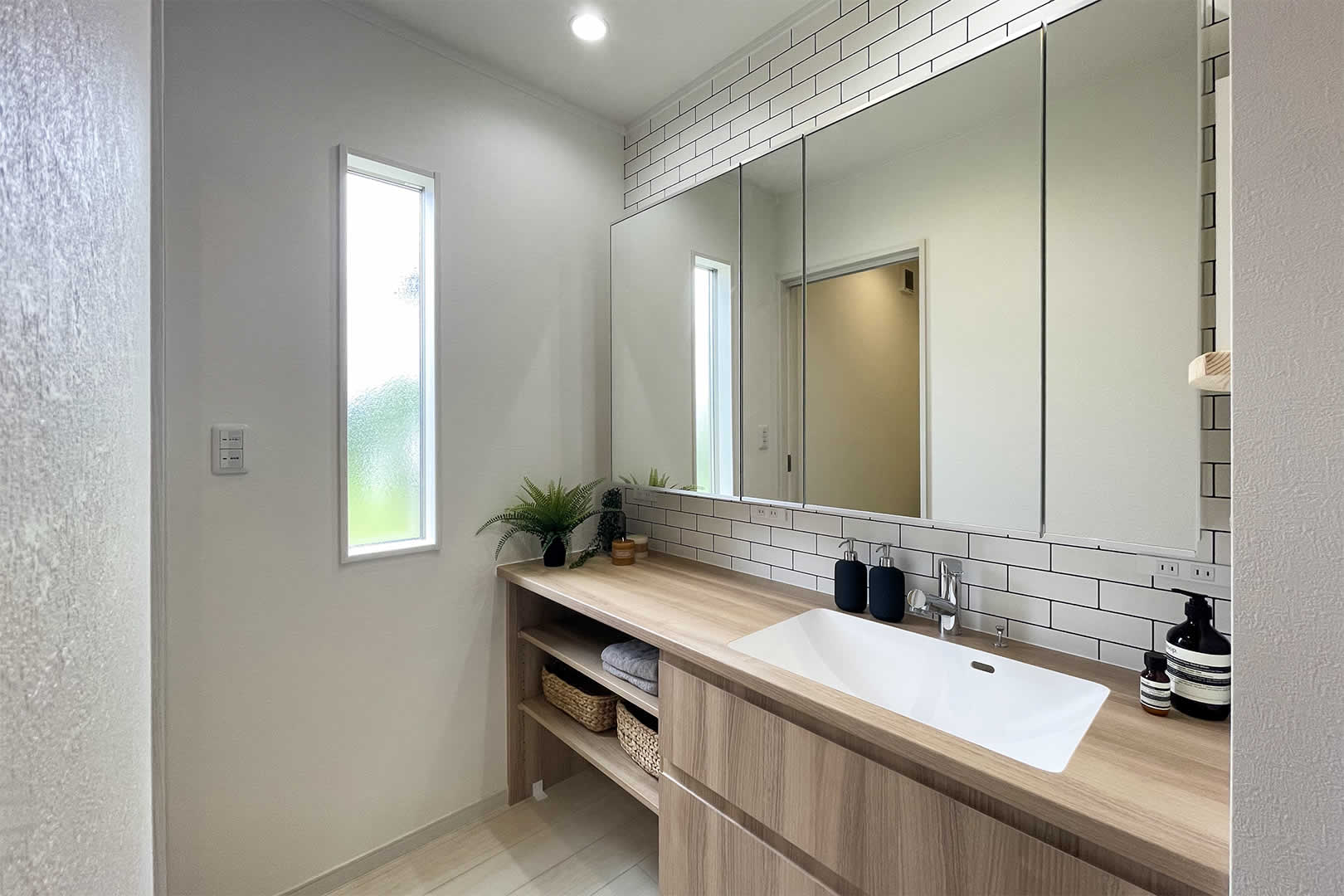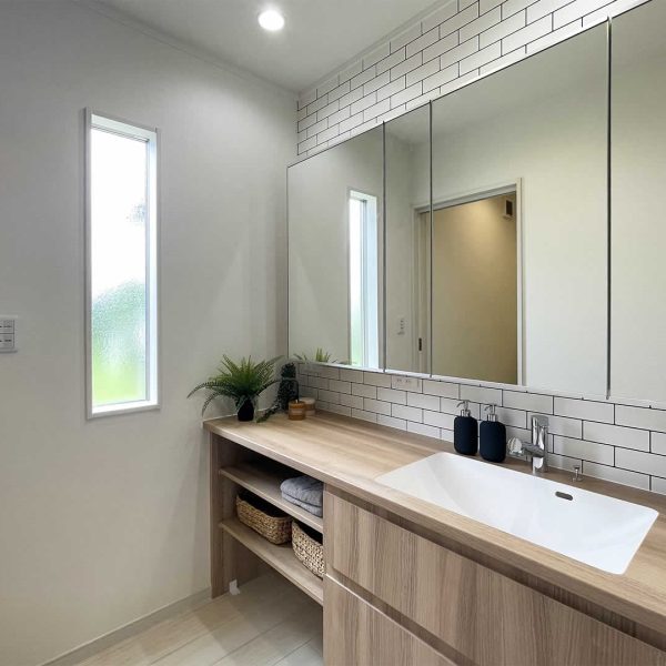 玄関すぐの洗面、帰宅後手洗いしてからリビングへ。幅広の洗面なので二人並んでも問題ありません。