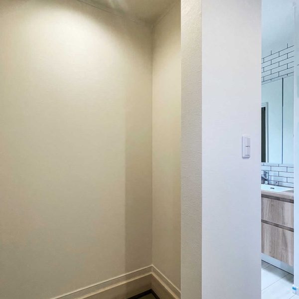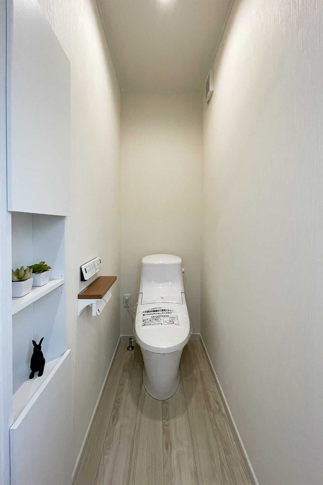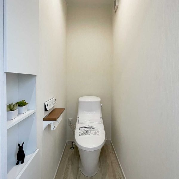 白い壁紙で清潔感のあるトイレ埋め込み収納があるのでトイレットペーパーのストックや掃除用品の収納も出来ます。