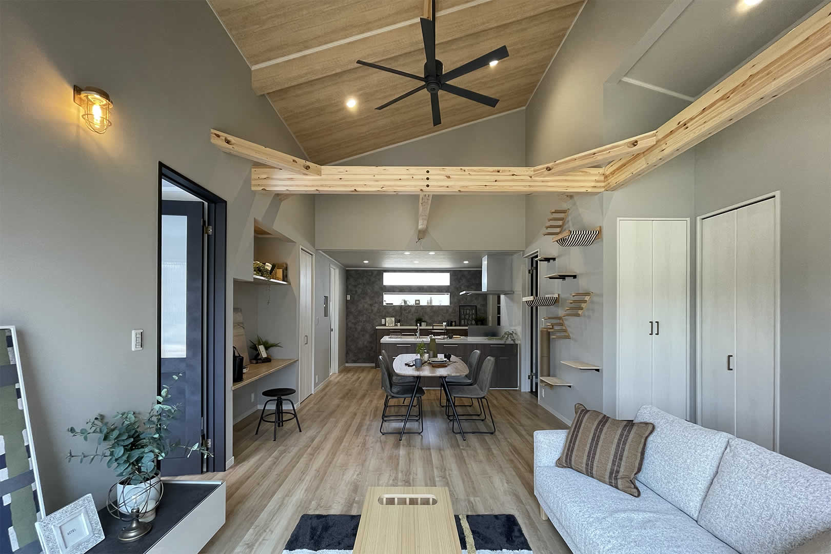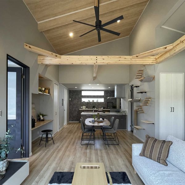 勾配天井にシーリングファンが付いた素敵な大空間。