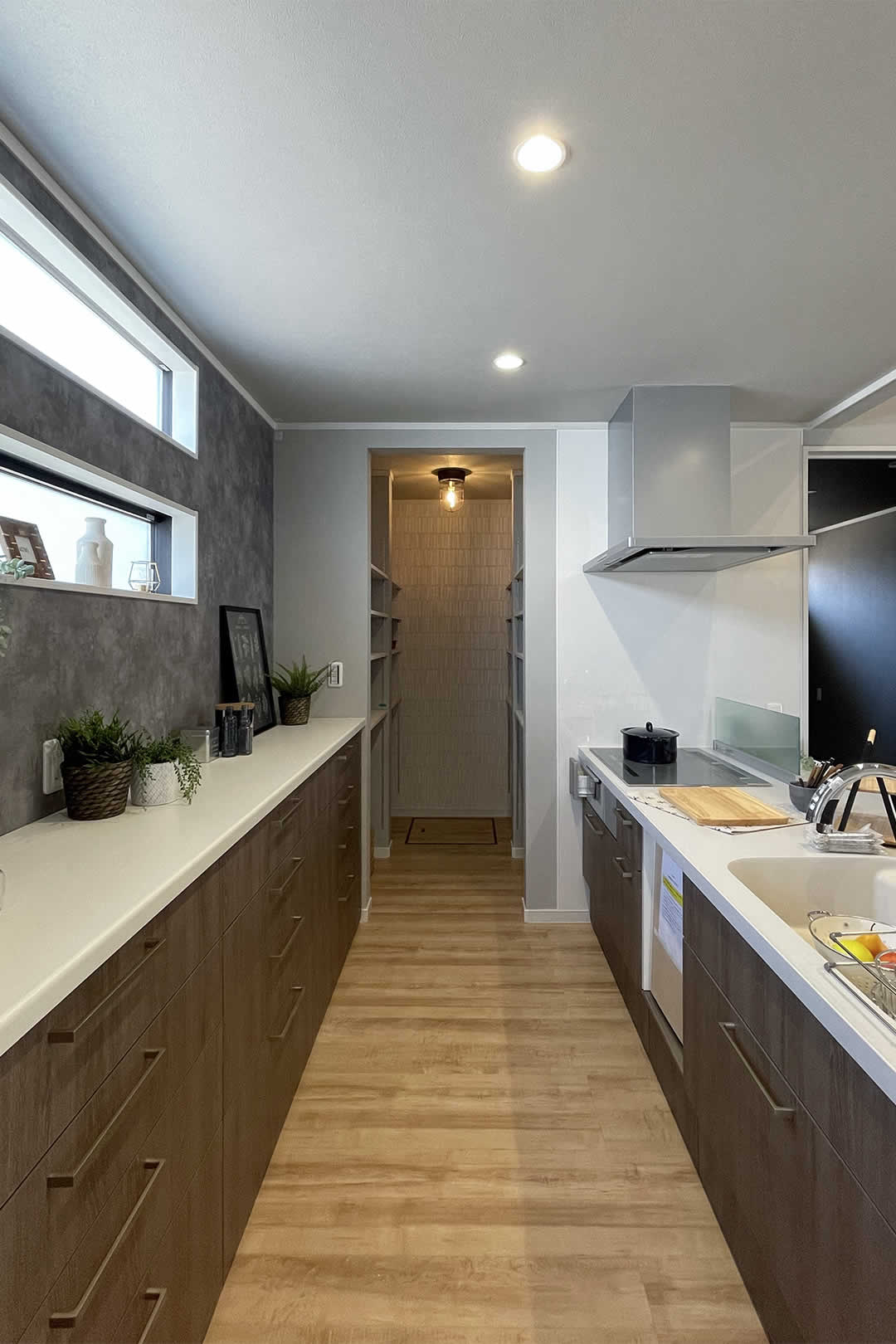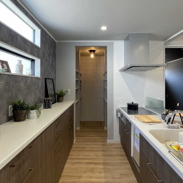 たくさんの収納ができるパントリーを奥側に動きやすい動線を確保したアイランドキッチン。