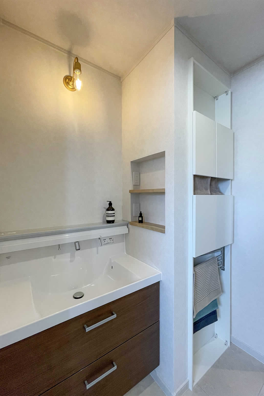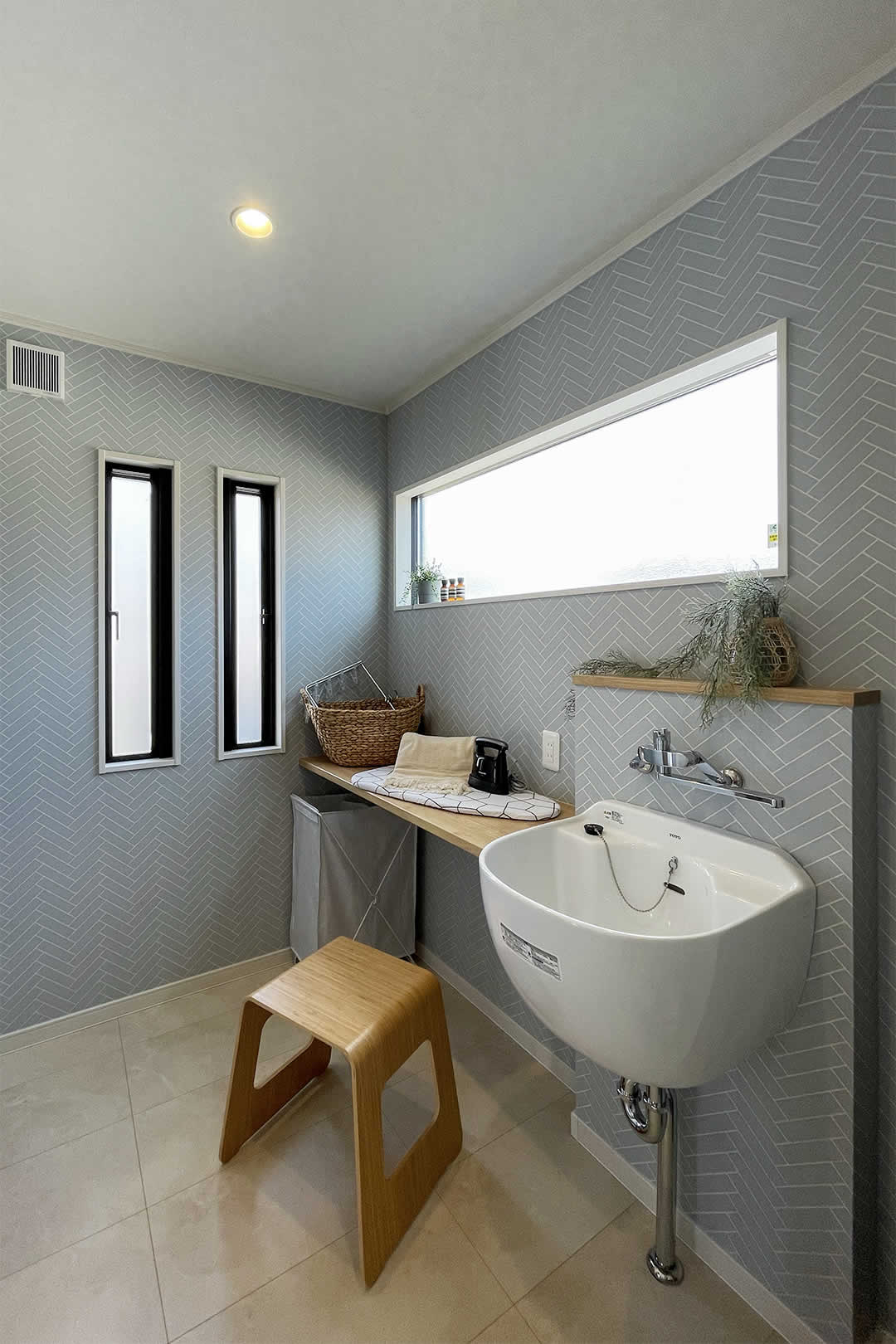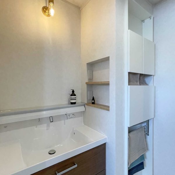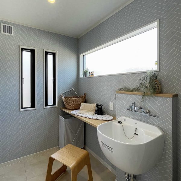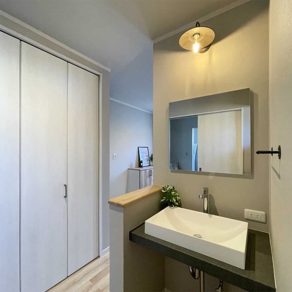 お家に帰ってきた時にお部屋に入る前に手洗いができて、お客様にも気軽に使ってもらえるホールの洗面台です。