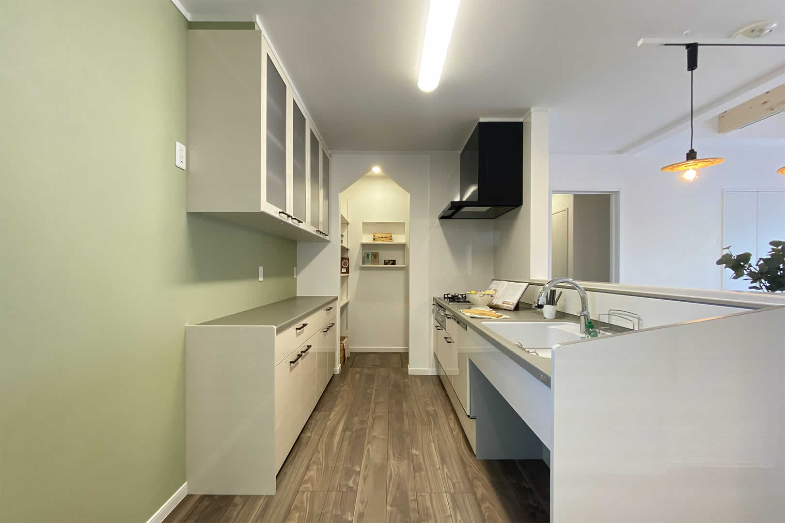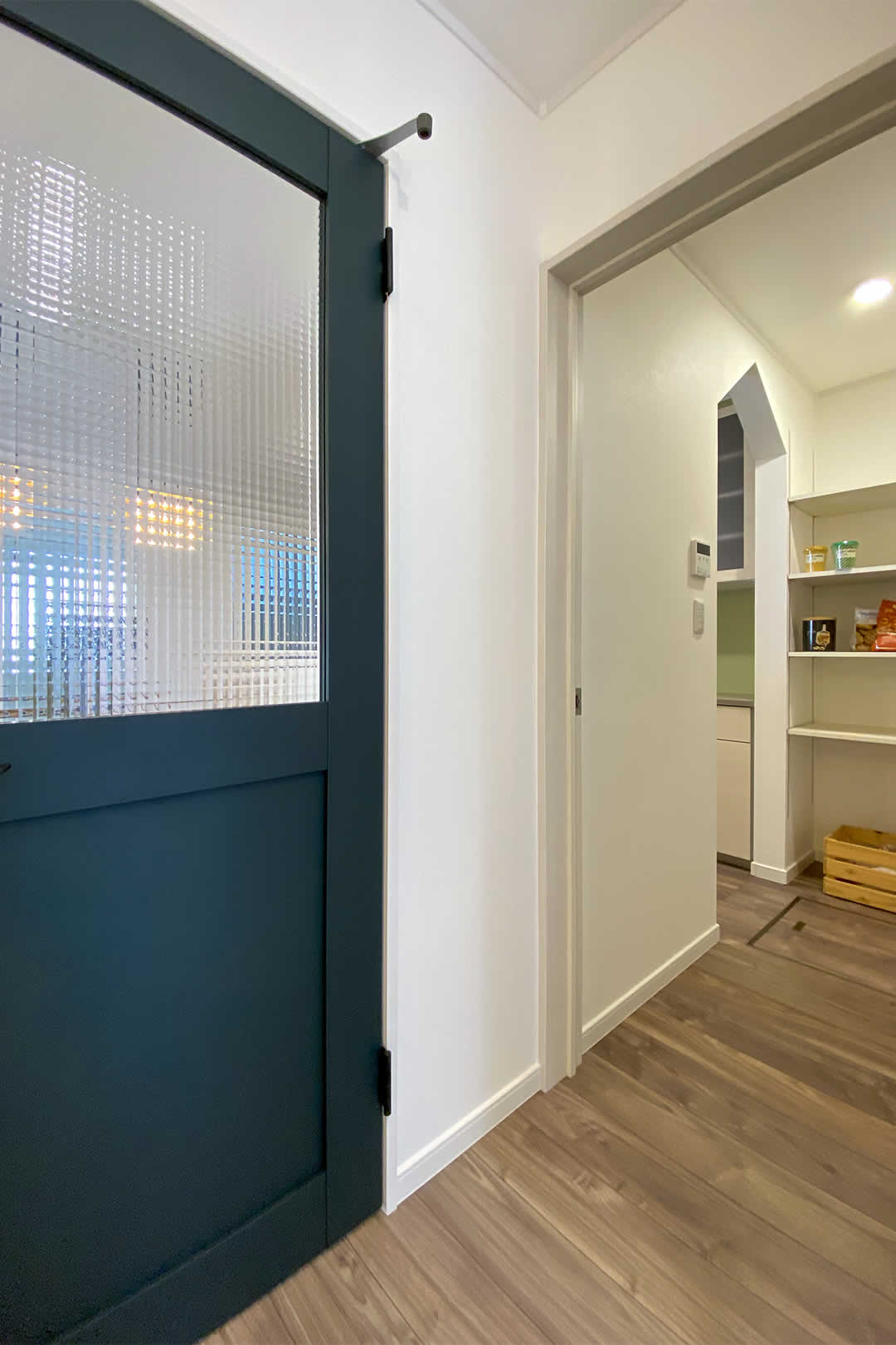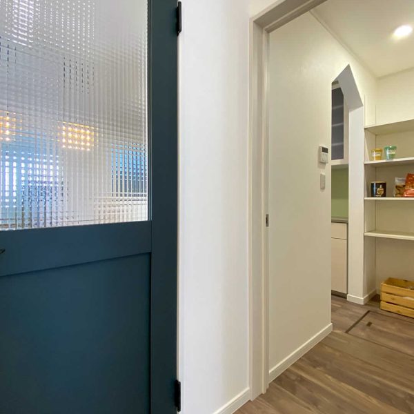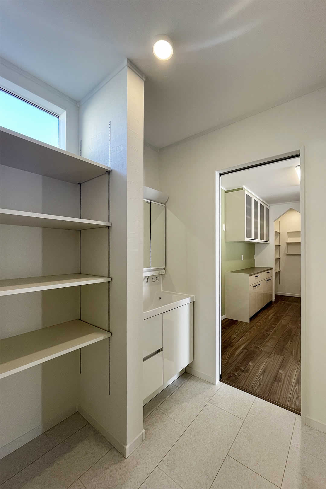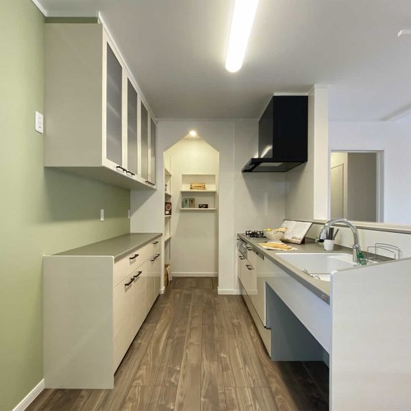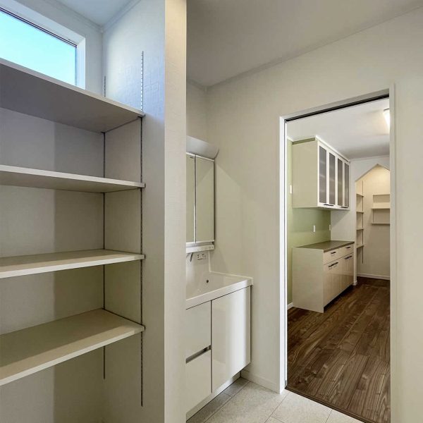 キッチン奥にはパントリーもあり食品のストックも可能です。動かせる棚になっているので収納力抜群です。玄関ホールから直接パントリーにも行けるので家事の時短にもなります。