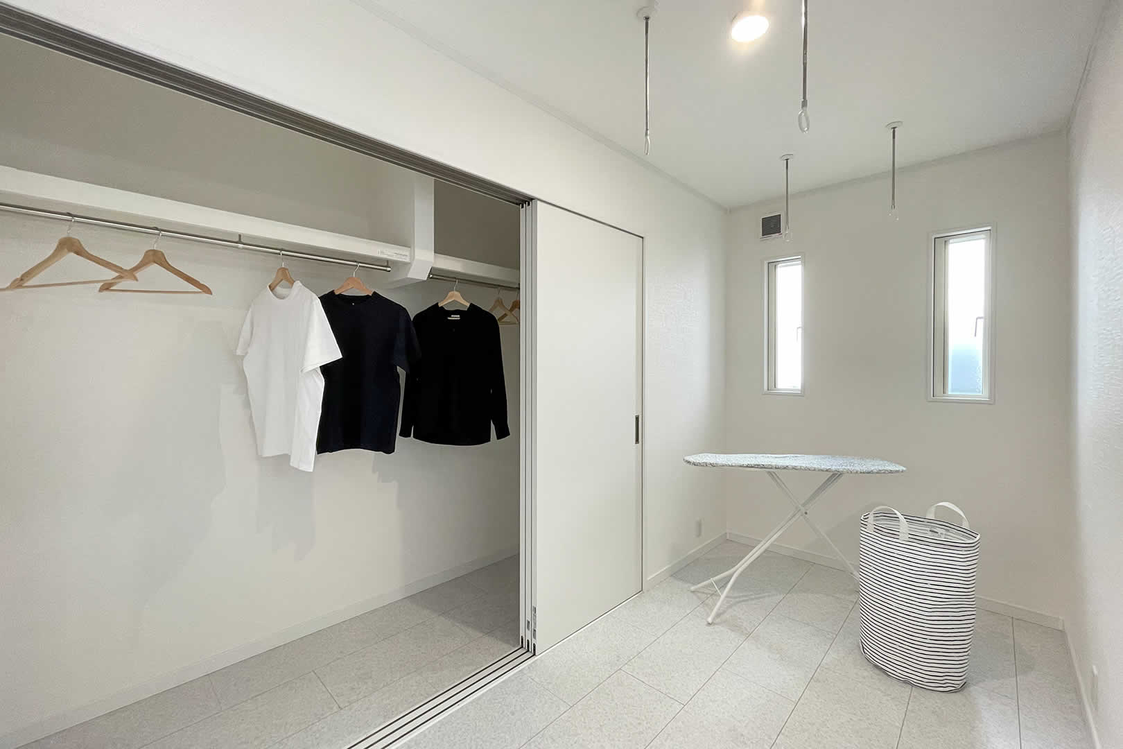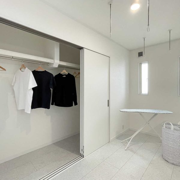 室内物干しがついており洗濯の後すぐに干すことが出来ることで時短になります。ユーティリティには大容量の収納もあるので洗濯物が乾いたらそのまま収納することができます。
