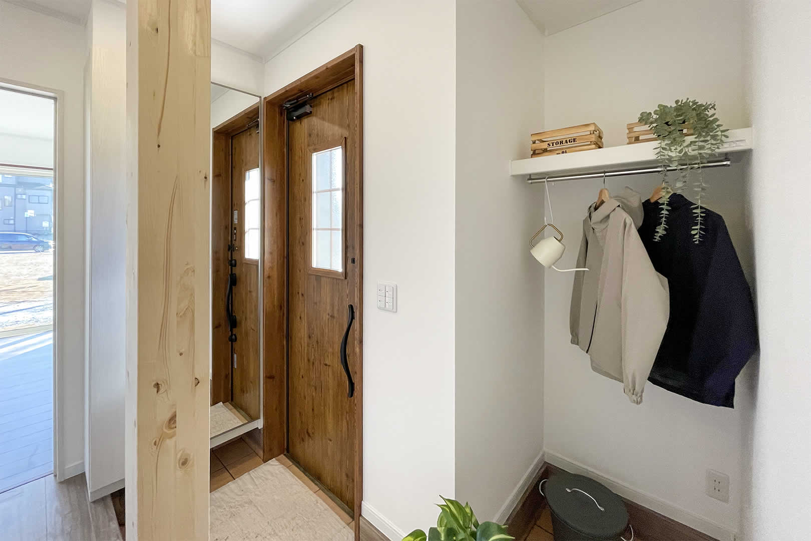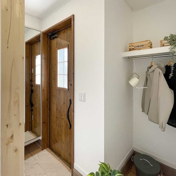 土間収納にハンガーパイプ付きの棚があり上着や小物など収納出来ます。
