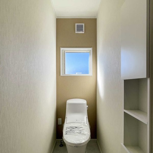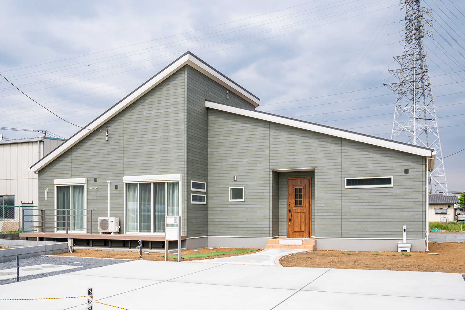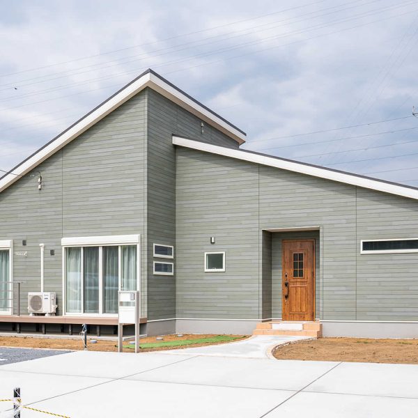 木目調の外壁を使用しナチュラルな外観に仕上げました。また、かけ違いの屋根にすることにより見た目にメリハリをつけてオシャレになっております。玄関とポーチのアクセントもお家のオシャレ感をアップさせています。
