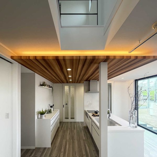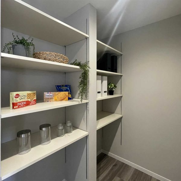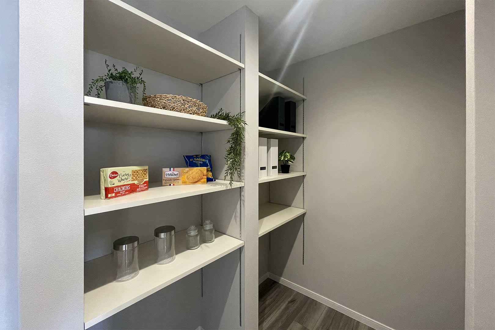 キッチンの奥には大容量のパントリーがあります。買いだめした食材等をストックできる大容量のパントリーがついたキッチンだから、料理がもっと楽しくなります。
