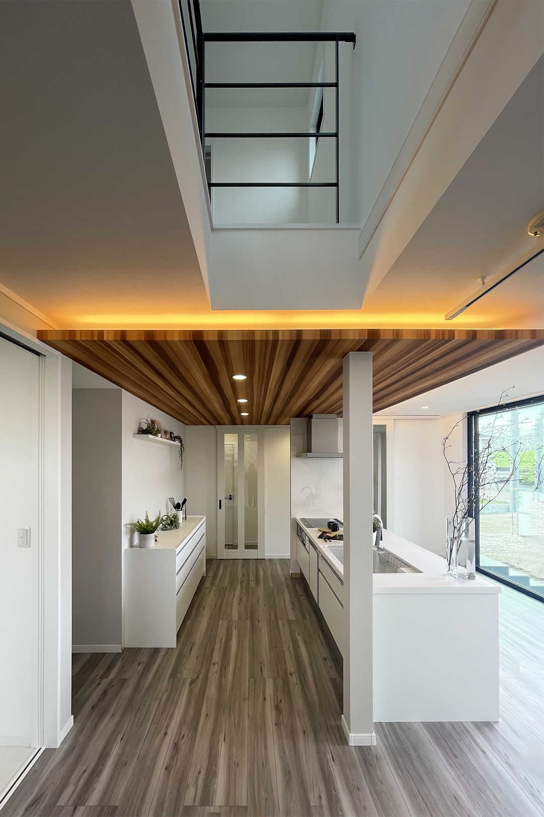 吹き抜け部分は格子の手すりでカッコよく仕上げ窓をつけることにより、ロフト部分と1階にも光が入ります。また、1階と2階を繋げる役目もありご家族の生活を繋げてくれます。
