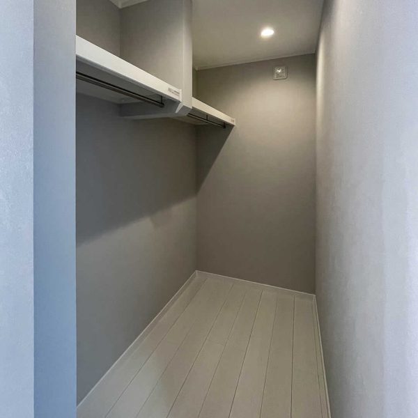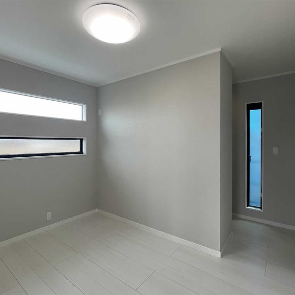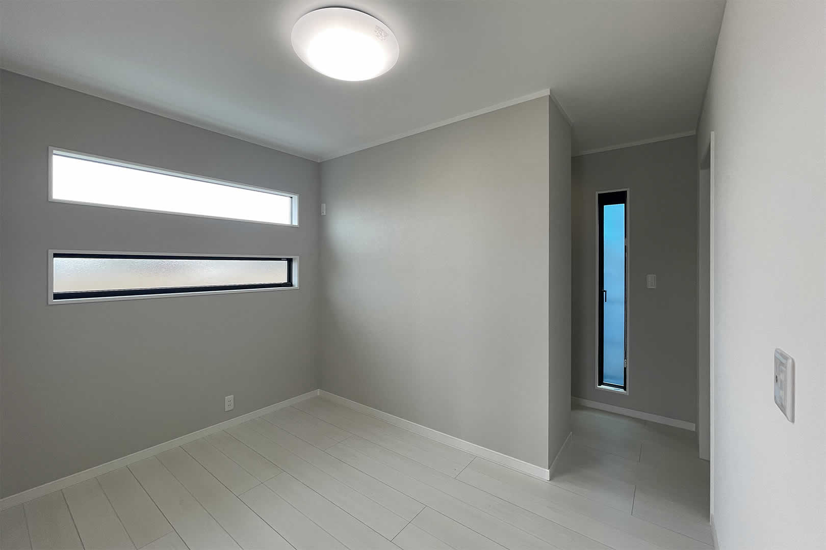 白とグレーが映える主寝室。ウォークインクロークへ直接入れるのでお片付けが楽になるのと、ファミリークロークもつながっているのでシンプルに広く使える空間となります。