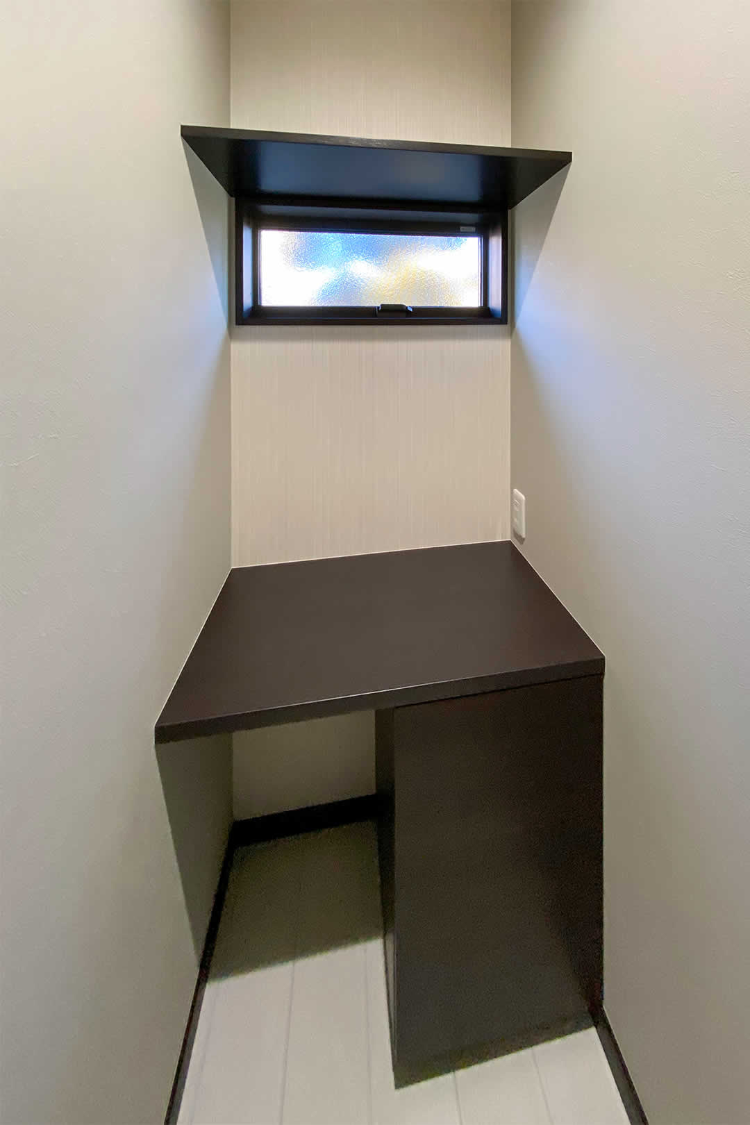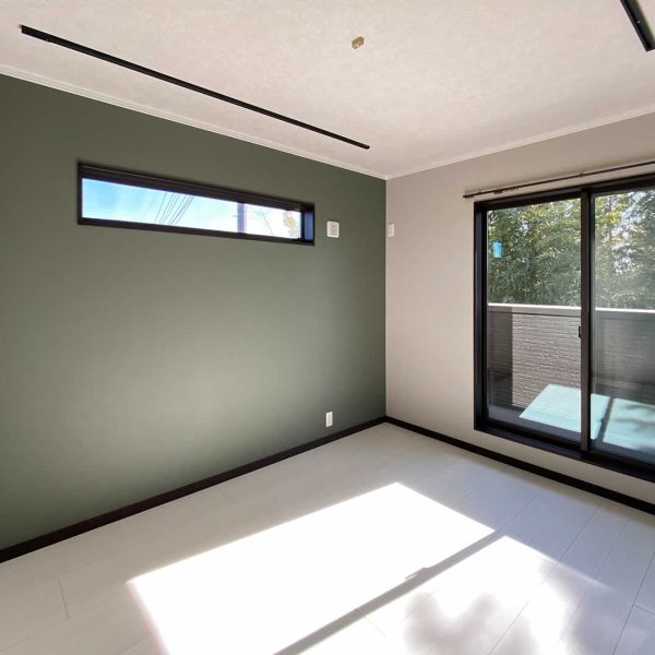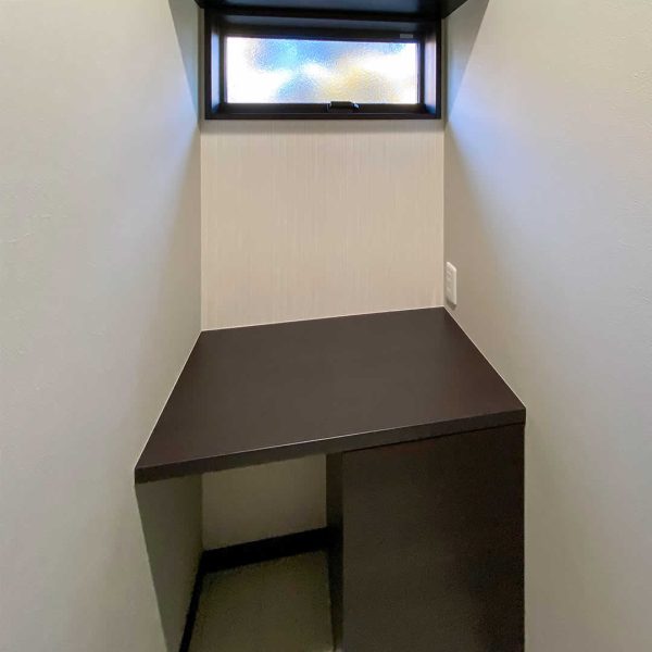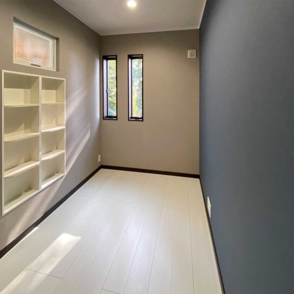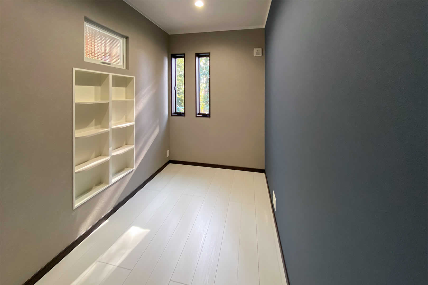 3帖のワークスペースは壁面に埋め込み収納を設置しスッキリとした空間に。南からの陽も入り、集中とくつろぐこともできる部屋となっております。