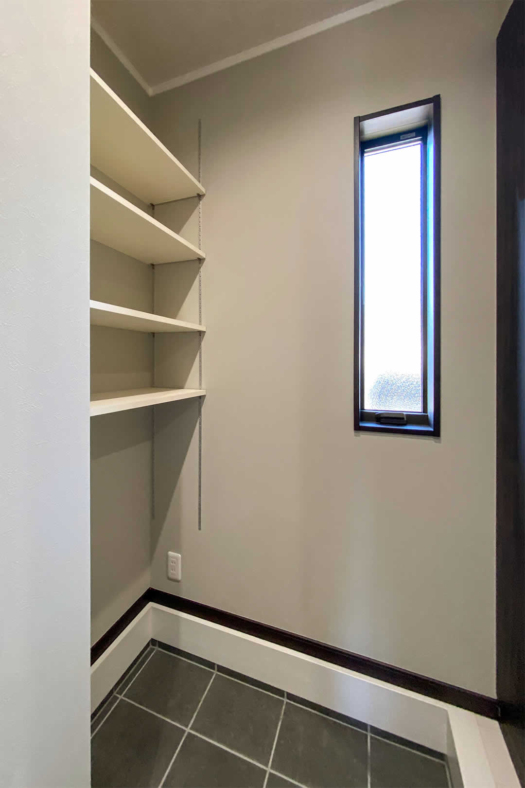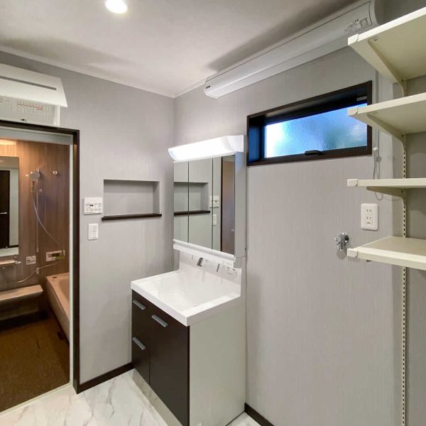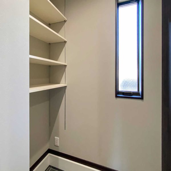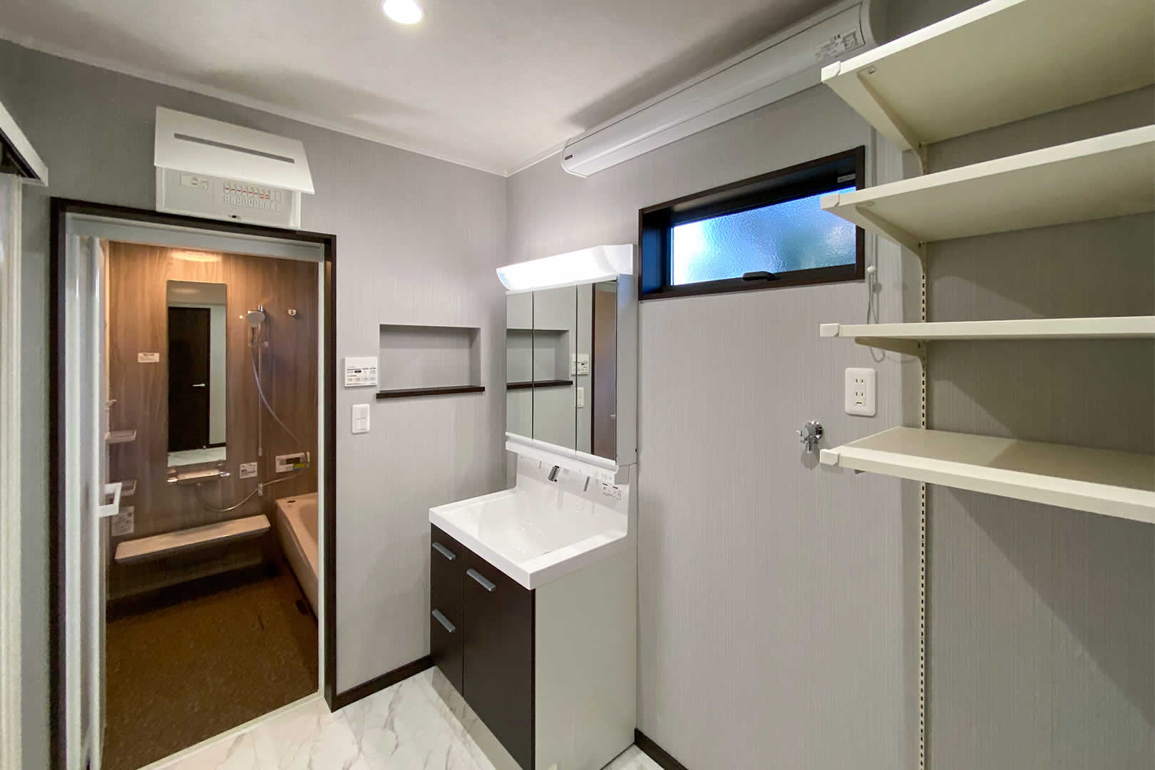 キッチンからの動線も考えたランドリールームは高さを変えられる棚もあり、収納がスッキリとできます。使わない時はしまえる物干しも便利な一品です。